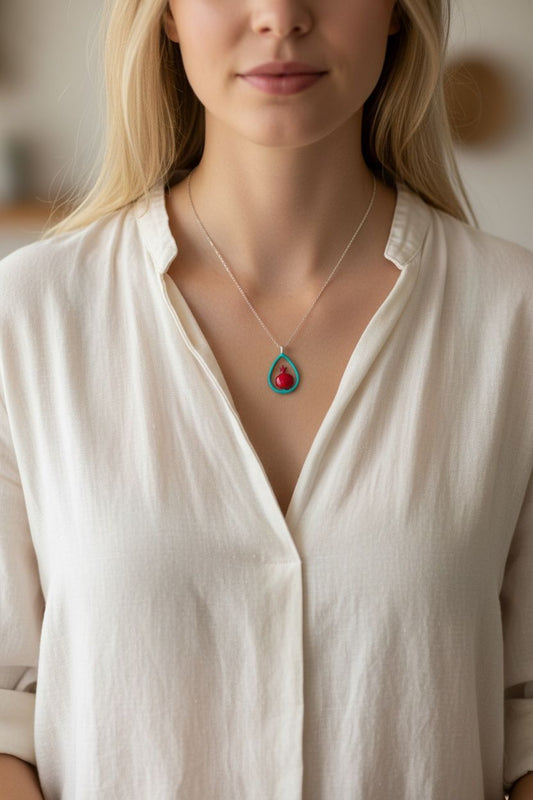 Kette mit Granatapfel-Anhänger – Handgefertigt mit Emaille in Türkis & Rot