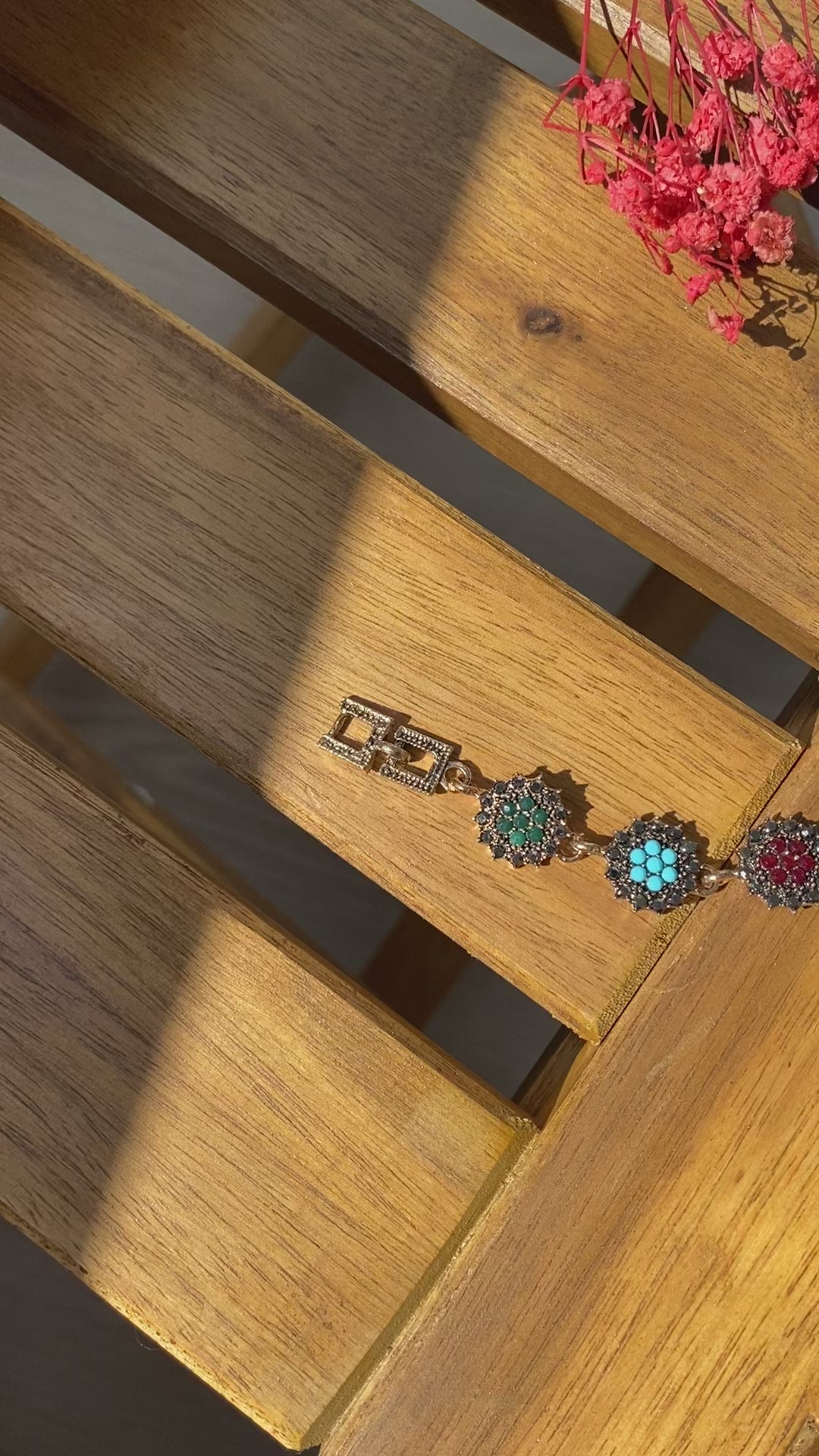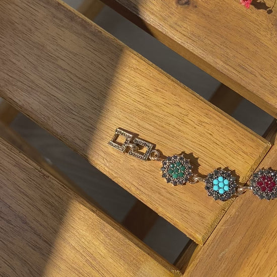 Dieses Armband vereint kräftige Farben mit goldfarbenen Akzenten und einem traditionellen Blütendesign. Die runden Glieder wechseln sich in Türkis, Dunkelgrün und Bordeaux ab – inspiriert von orientalischer Mosaikkunst. Die warme Metallfarbe verleiht dem Schmuckstück eine edle Note und macht es zum perfekten Begleiter für festliche Outfits oder besondere Alltagsmomente.
