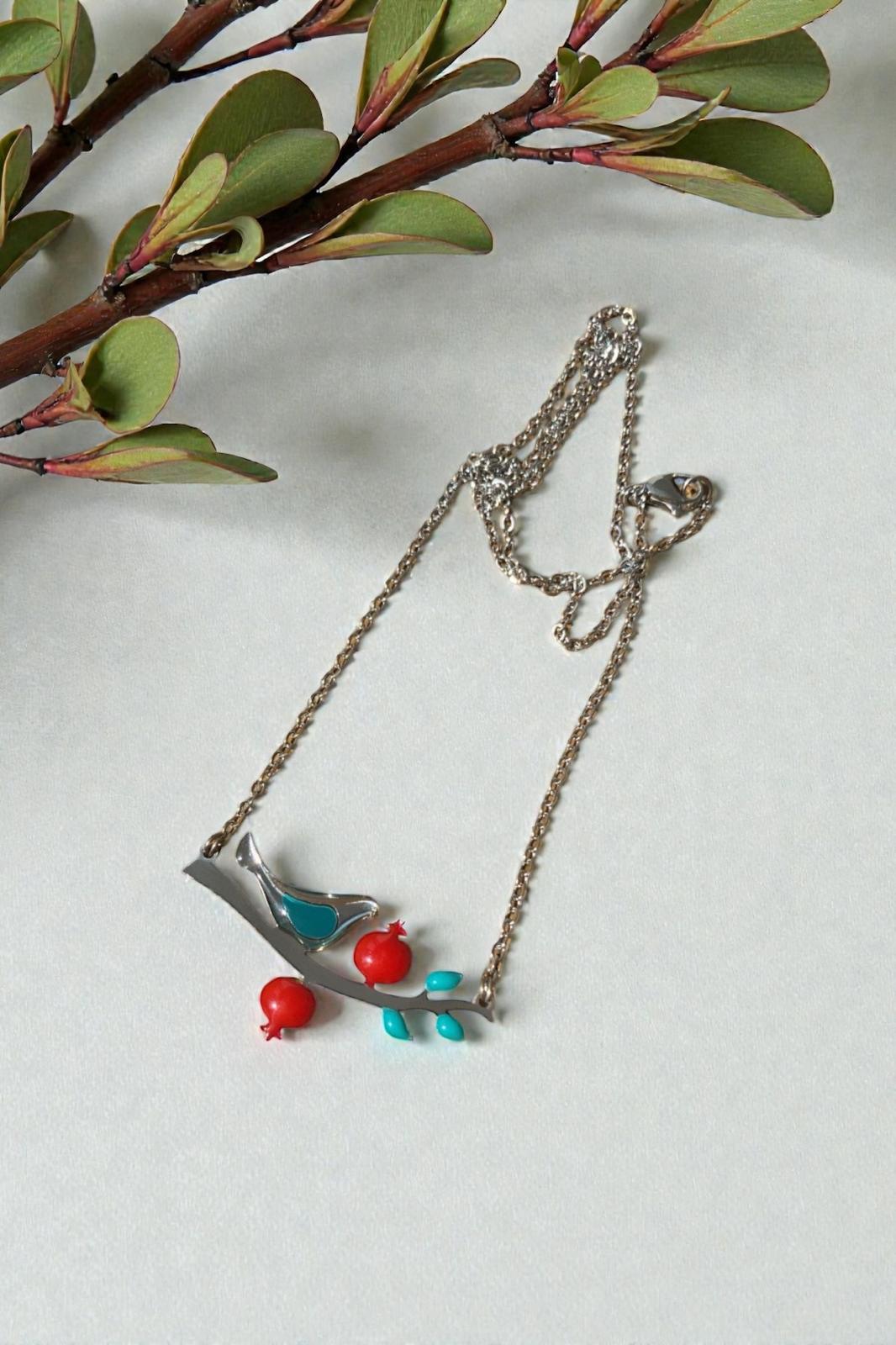Diese zauberhafte Halskette vereint poetische Naturmotive mit einem Hauch orientalischer Symbolik. Der detailreiche Anhänger zeigt einen stilisierten Vogel auf einem Ast mit zwei roten Granatäpfeln und türkisen Blättern – ein Zusammenspiel von Natur, Leben und Harmonie.