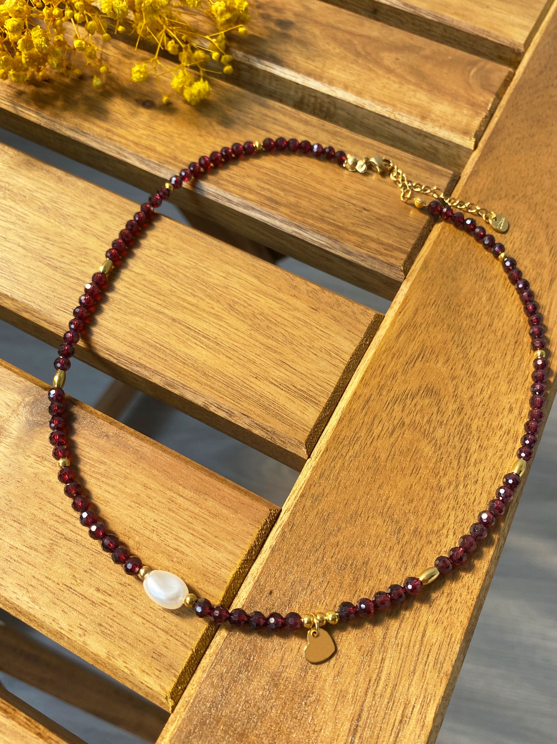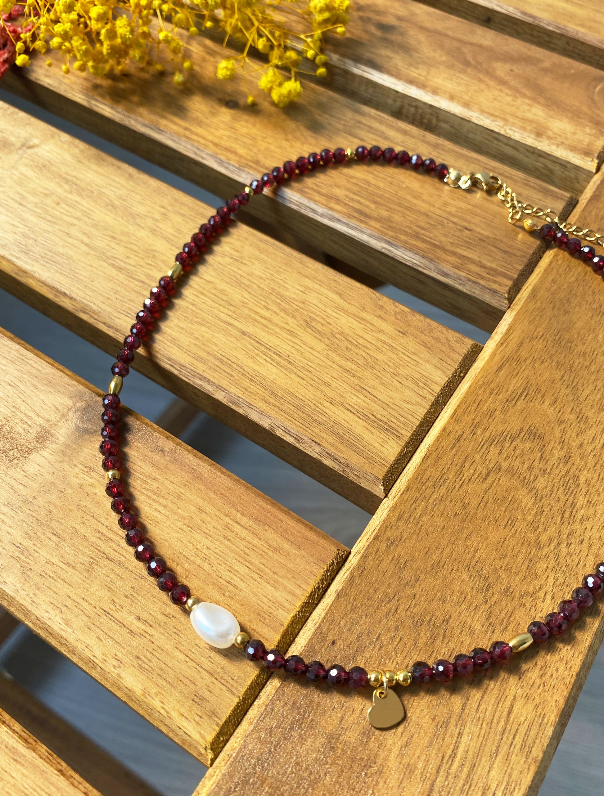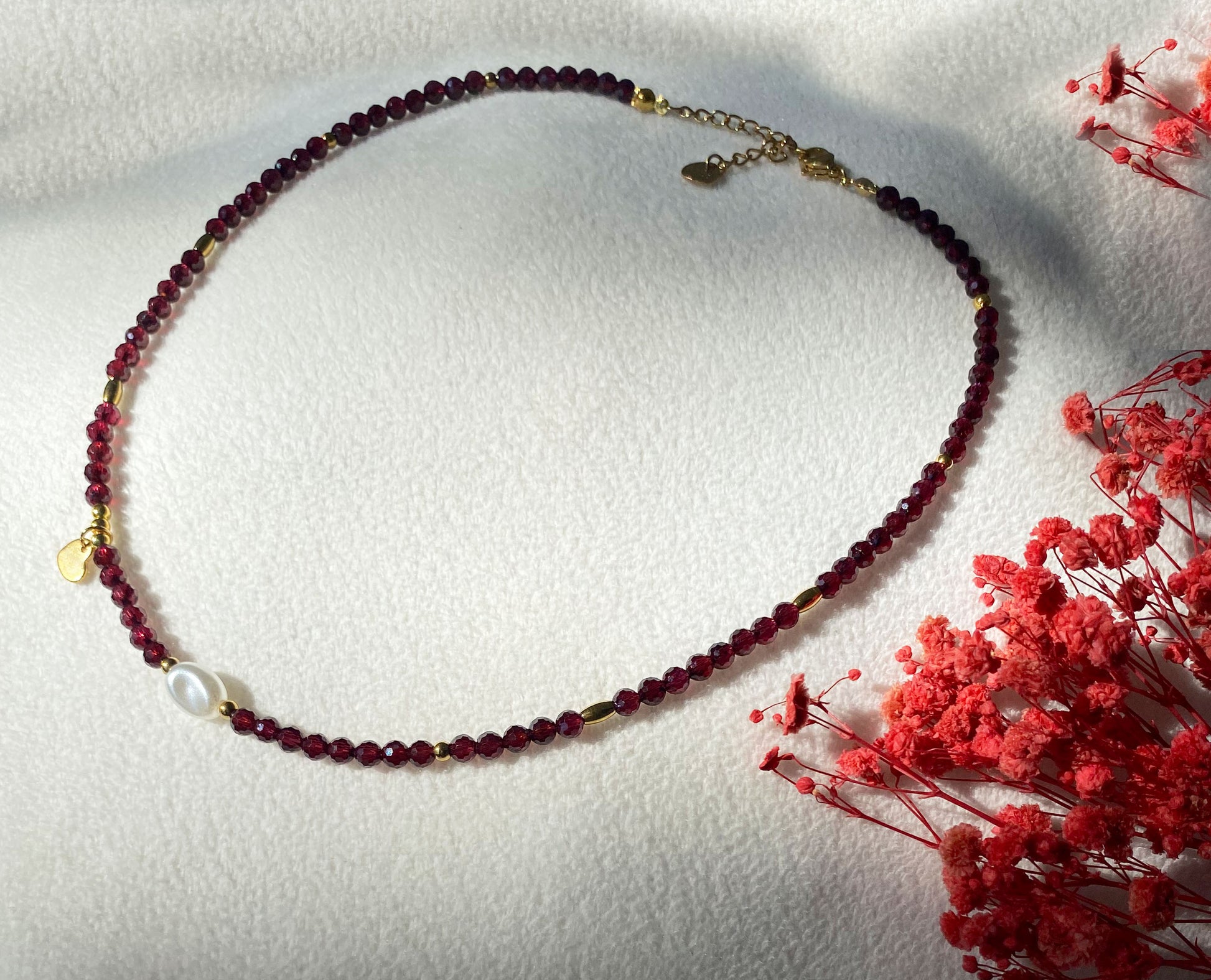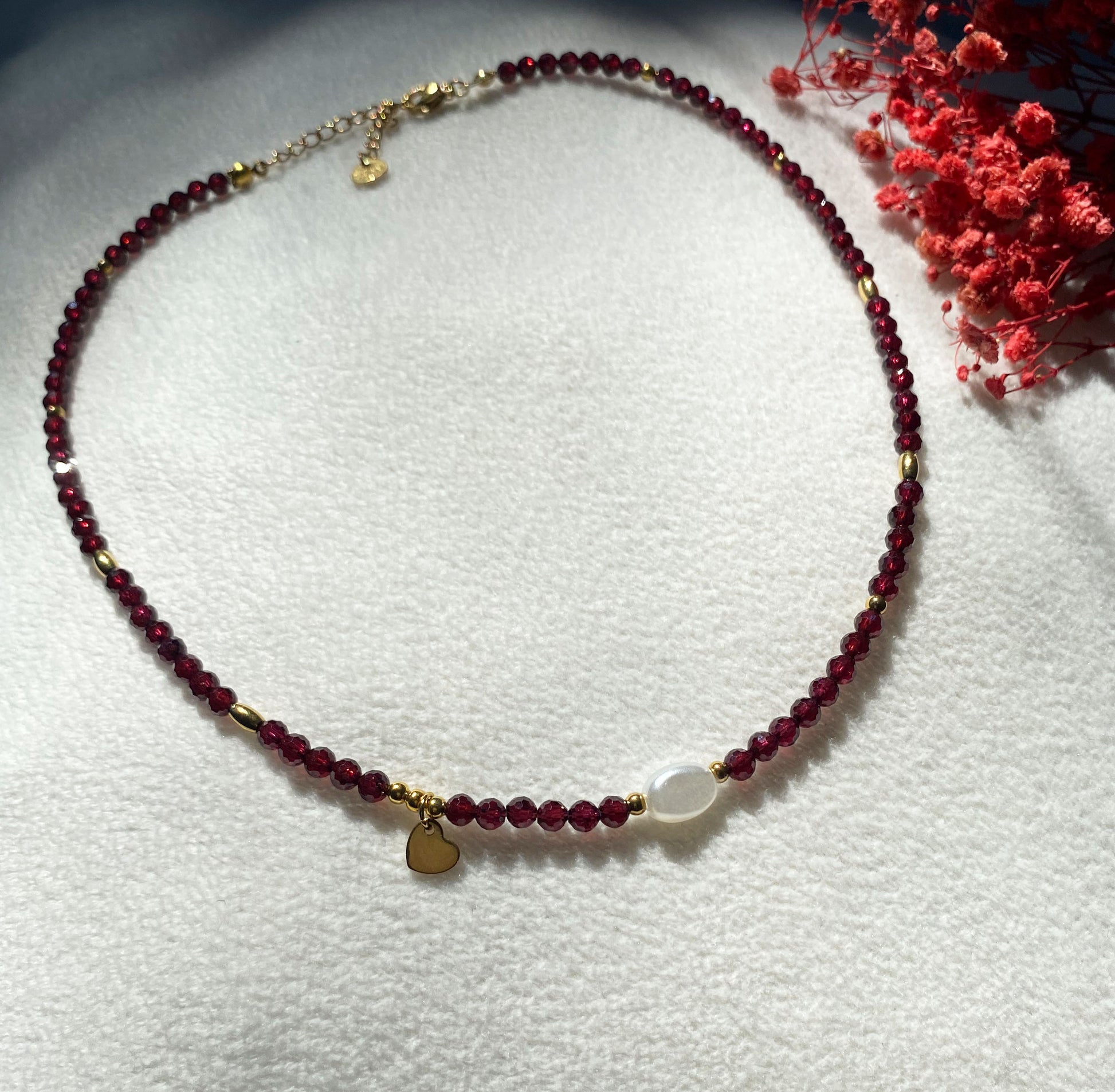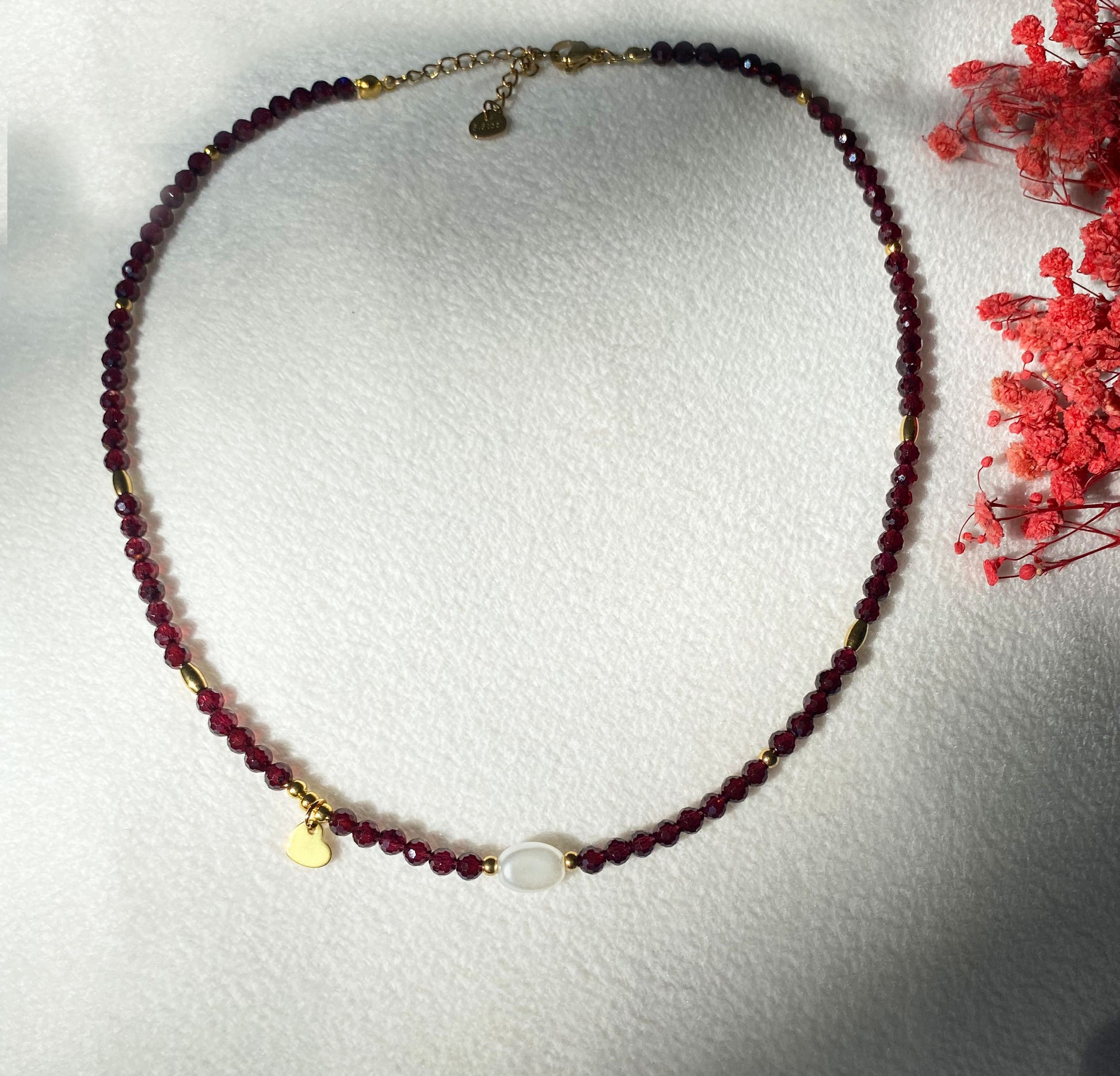 Tiefrote Natursteinperlen (ca. 4 mm, facettiert) machen diese Halskette zu einem edlen Schmuckstück mit ausdrucksstarkem Charakter. Zwischen den dunklen Steinen setzen goldfarbene Edelstahlelemente warme Akzente, während eine einzelne weiße Perle für einen feinen Kontrast sorgt. Als Highlight schmückt ein kleiner Herz-Anhänger aus Edelstahl (ca. 6,5 × 7 mm) die Kette und verleiht ihr eine romantische Note.