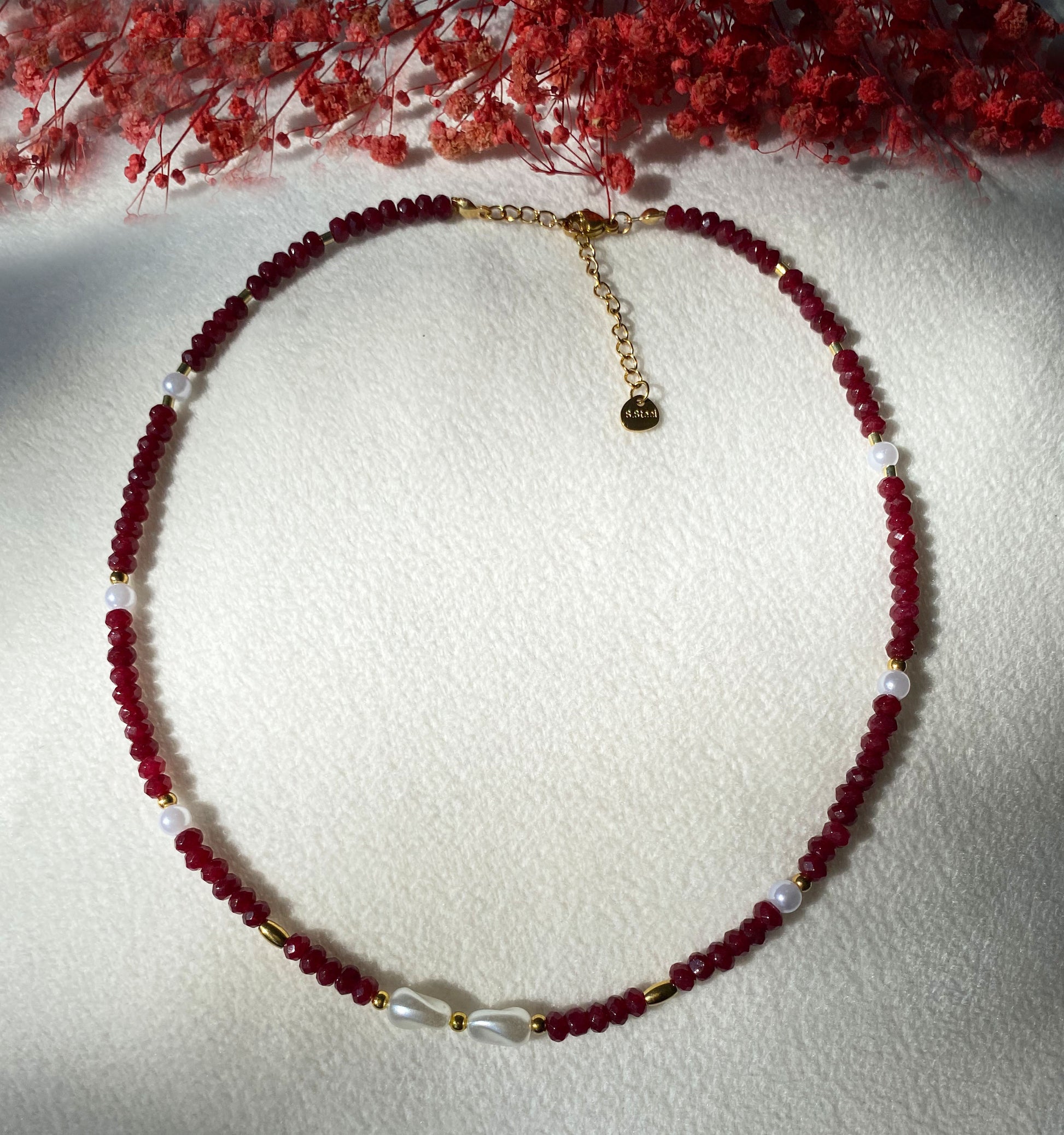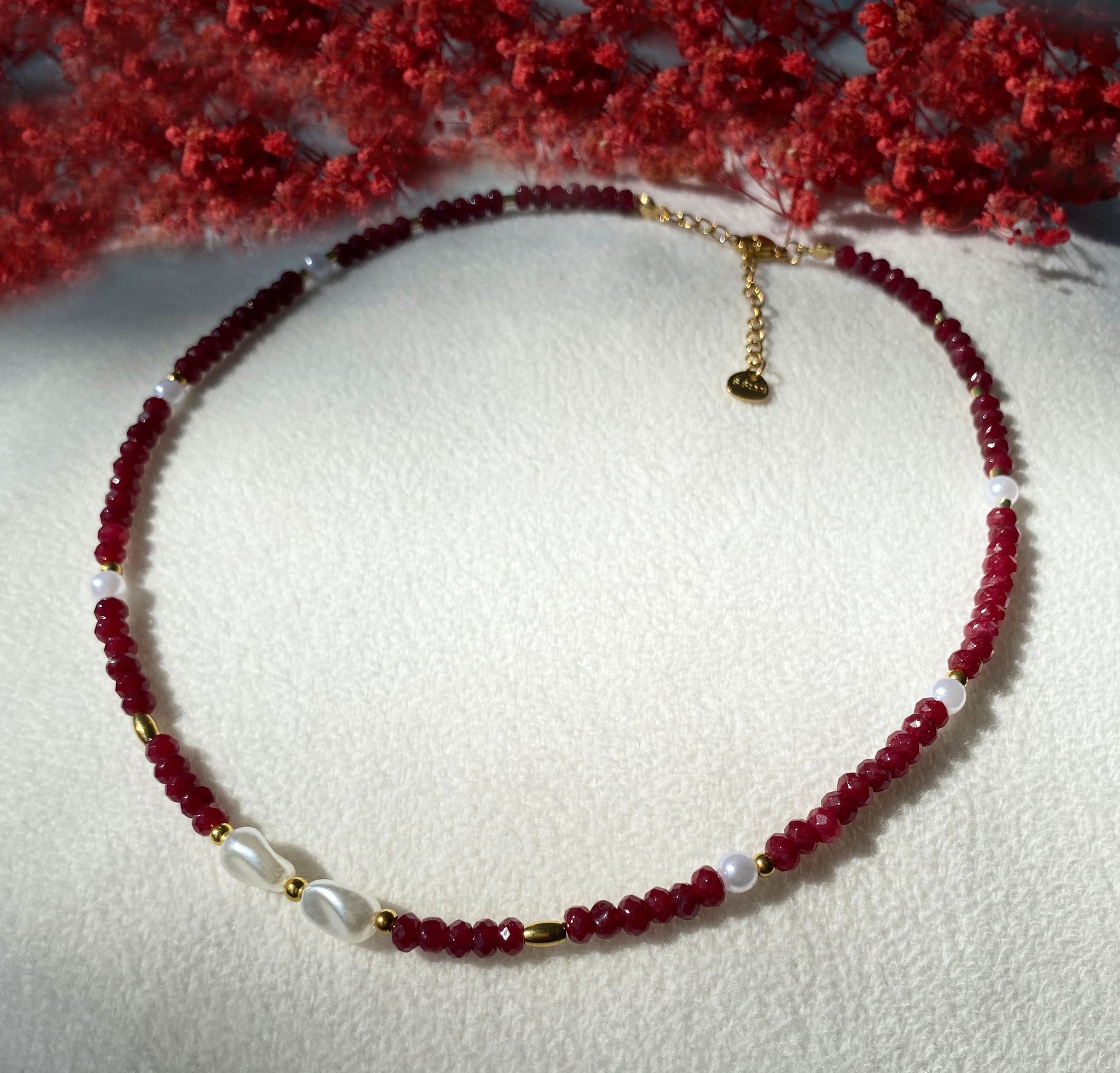 Ein zeitloser Klassiker in edlem Rot: Diese handgefertigte Halskette kombiniert facettierte Natursteinperlen (ca. 3 × 4 mm) mit eleganten weißen Perlen und goldfarbenen Edelstahl-Elementen. Das Spiel aus kräftigen und hellen Tönen verleiht dem Schmuckstück eine stilvolle Ausstrahlung und macht es vielseitig tragbar – von Alltagslooks bis hin zu festlichen Outfits.