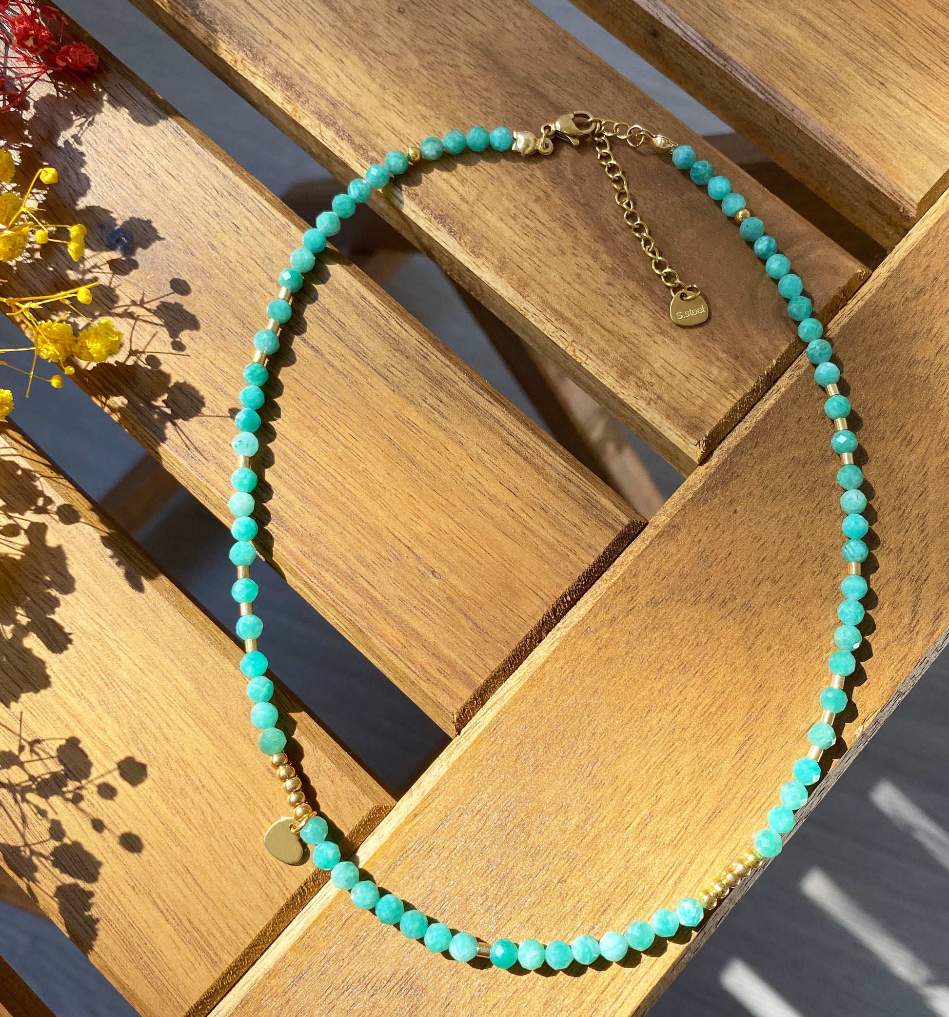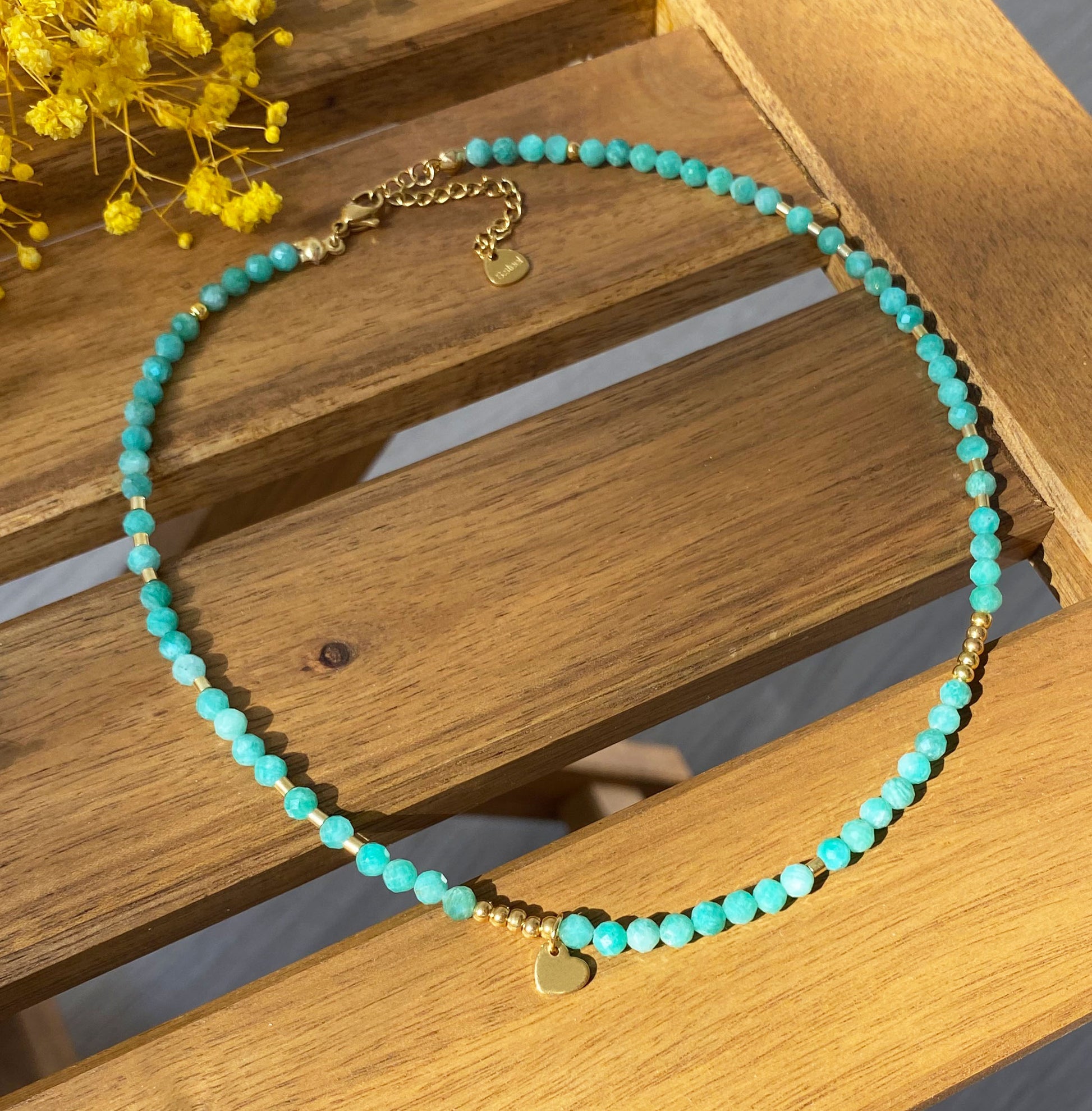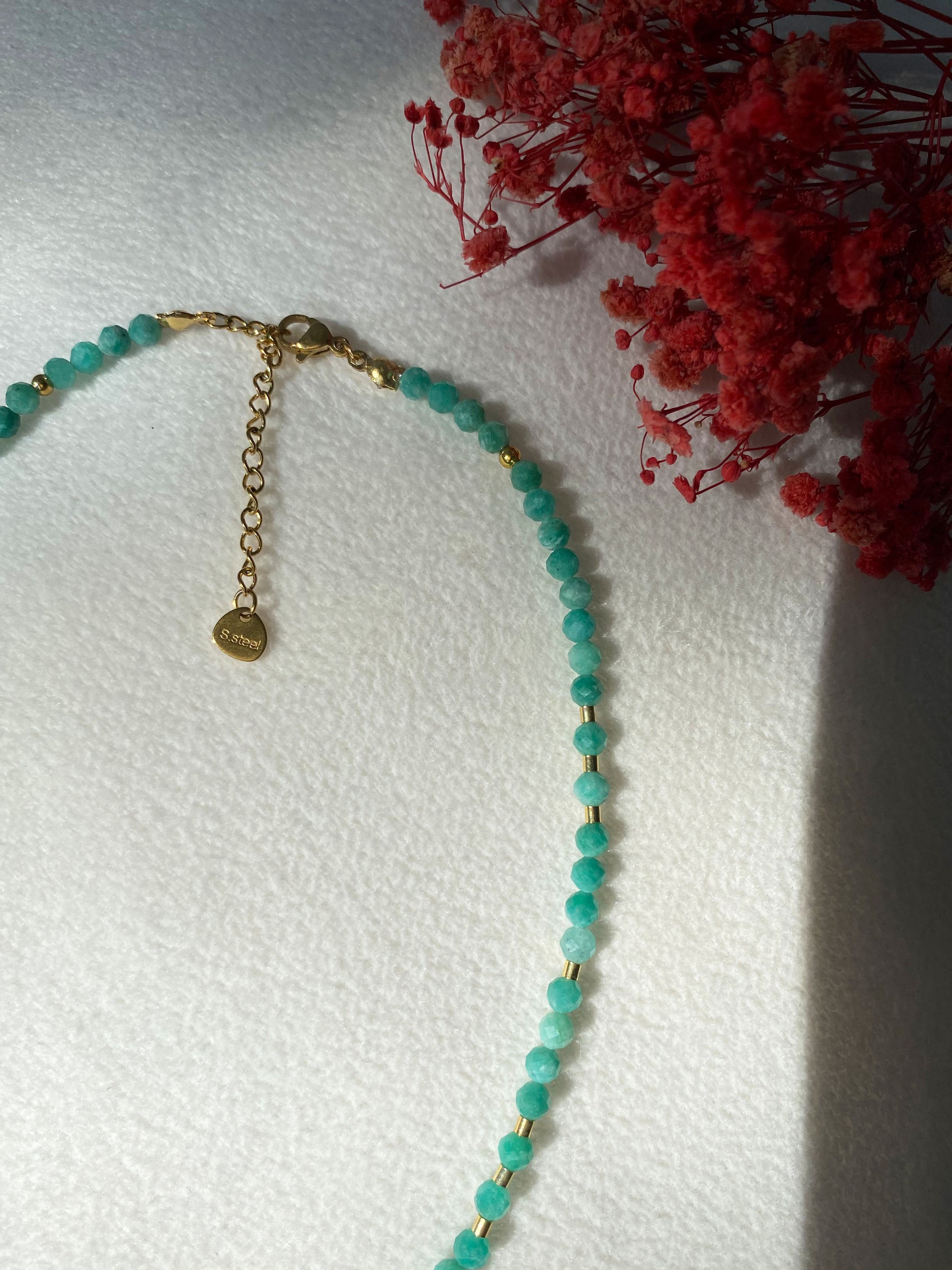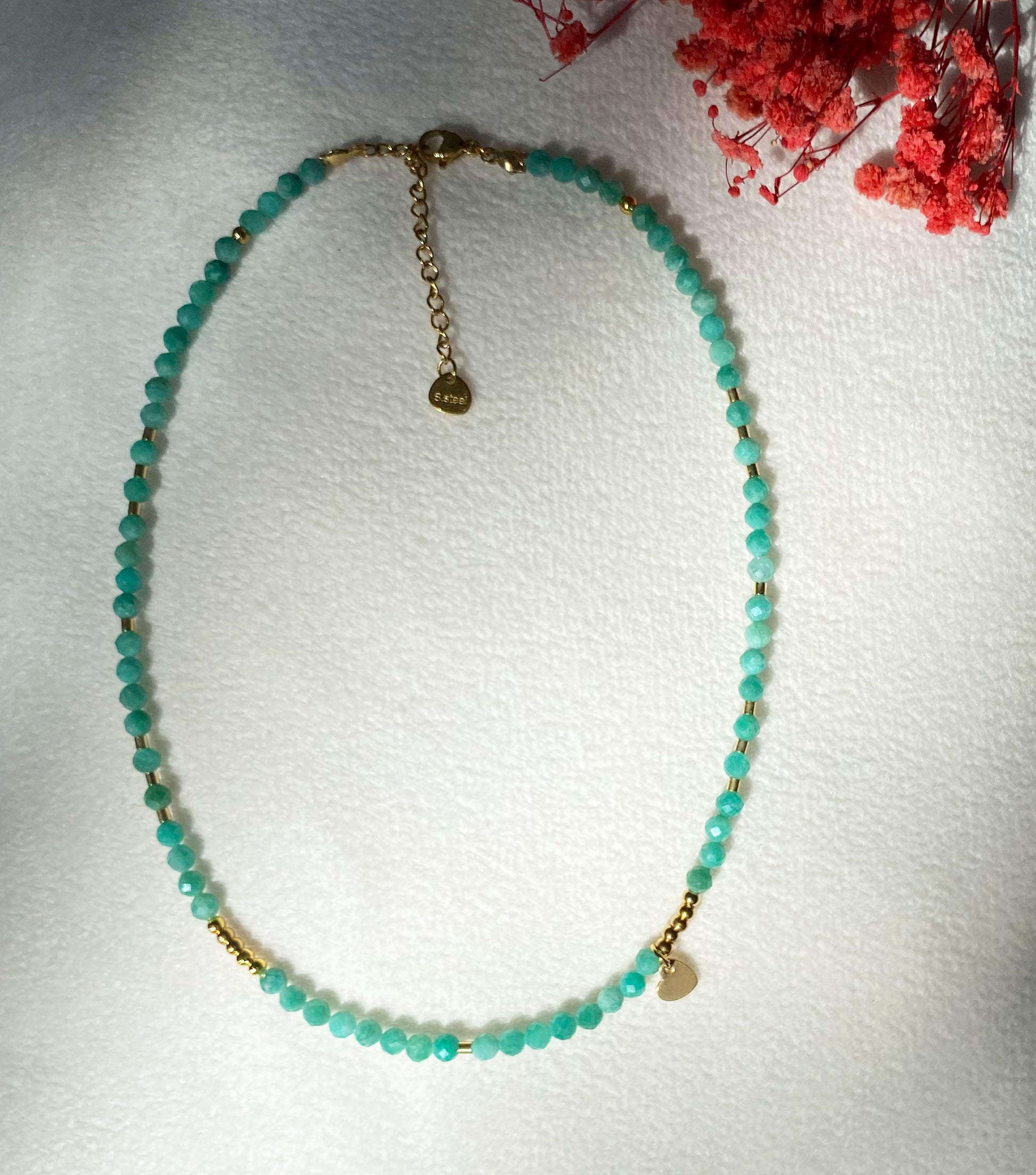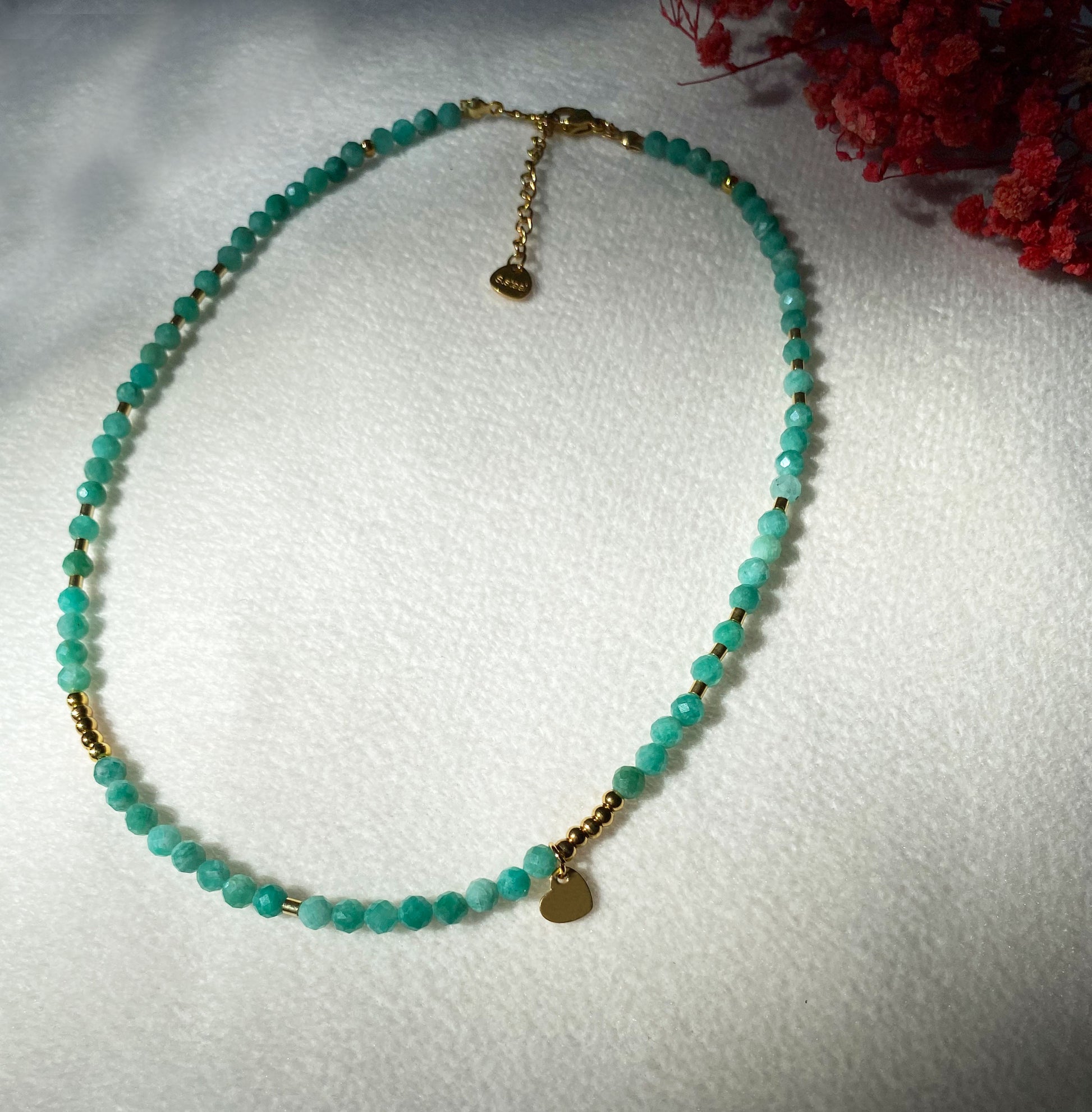 Facettierte Natursteinperlen in zartem Türkisblau verleihen dieser Halskette eine elegante, frische Ausstrahlung. Zwischen den Steinen sorgen goldfarbene Edelstahlelemente für feine Akzente. Im Mittelpunkt steht ein kleiner Herz-Anhänger aus Edelstahl (ca. 6,5 × 7 mm), der dem Schmuckstück eine feminine und stilvolle Note verleiht.