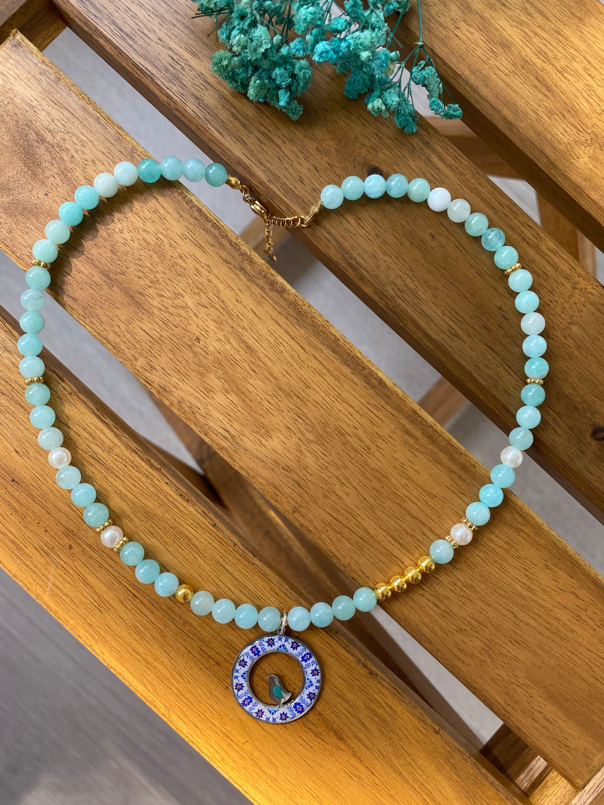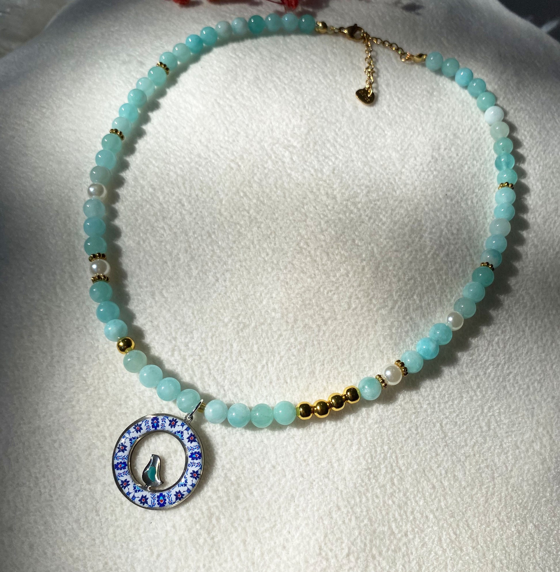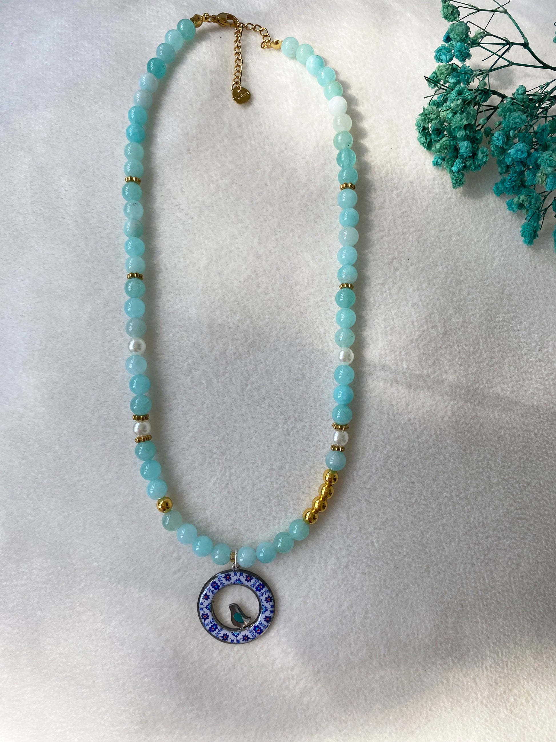 Ein harmonisches Zusammenspiel aus Naturstein und traditioneller Ornamentik: Diese handgefertigte Halskette besteht aus runden, hellblauen Natursteinperlen (ca. 6 mm), die durch goldfarbene Edelstahlelemente ergänzt werden. Highlight ist der runde Anhänger aus Edelstahl mit feiner Emaille-Verzierung in Blau und Weiß, in dessen Mitte ein türkisfarbener Vogel zu sehen ist – Symbol für Freiheit und Leichtigkeit.