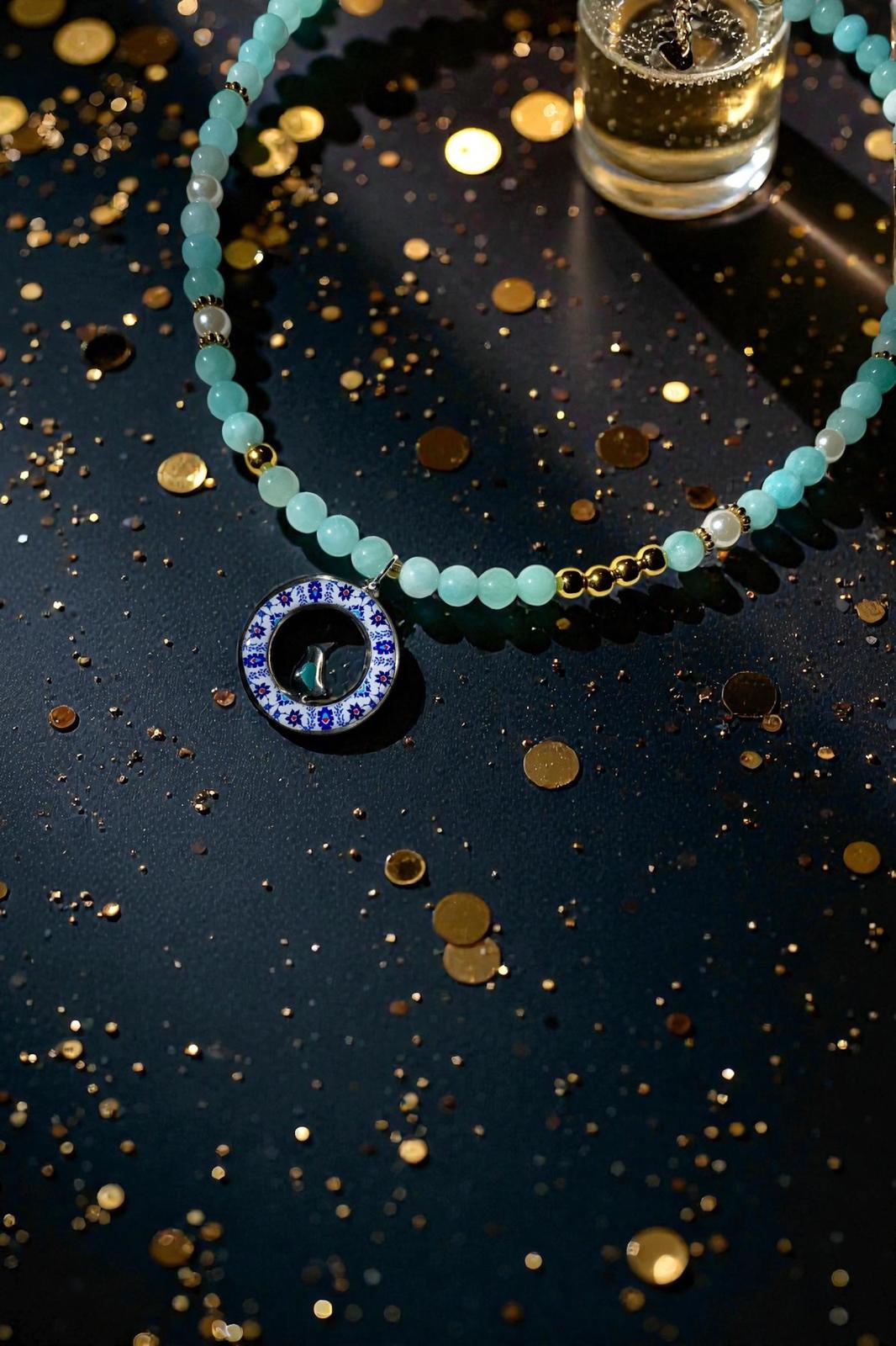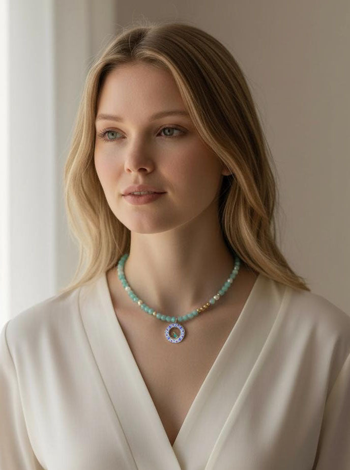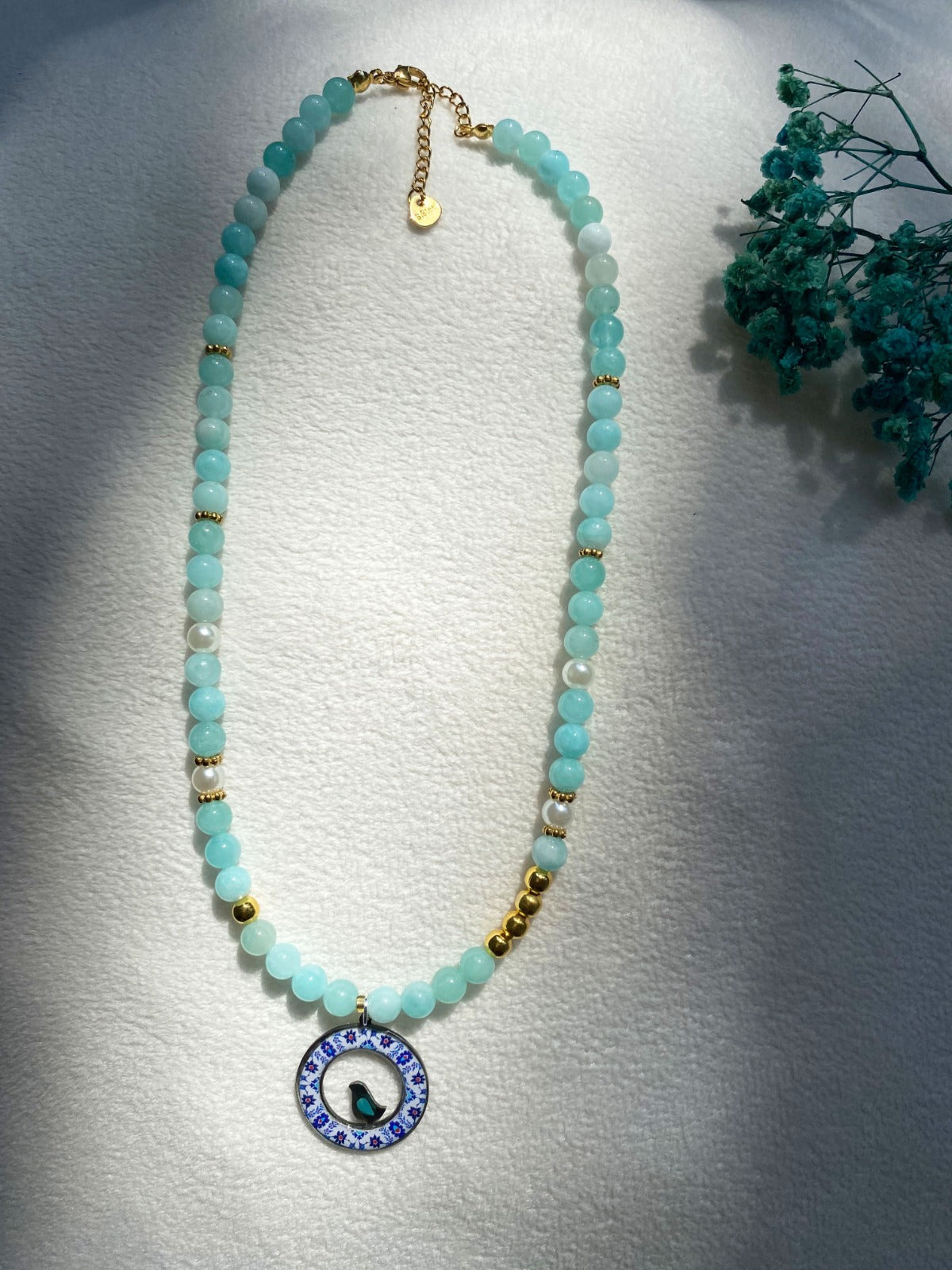 Ein harmonisches Zusammenspiel aus Naturstein und traditioneller Ornamentik: Diese handgefertigte Halskette besteht aus runden, hellblauen Natursteinperlen (ca. 6 mm), die durch goldfarbene Edelstahlelemente ergänzt werden. Highlight ist der runde Anhänger aus Edelstahl mit feiner Emaille-Verzierung in Blau und Weiß, in dessen Mitte ein türkisfarbener Vogel zu sehen ist – Symbol für Freiheit und Leichtigkeit.