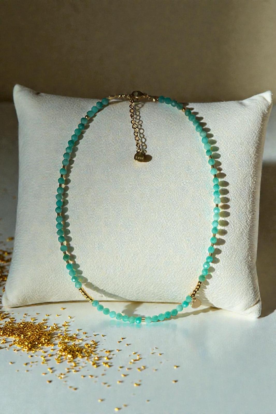 Facettierte Natursteinperlen in zartem Türkisblau verleihen dieser Halskette eine elegante, frische Ausstrahlung. Zwischen den Steinen sorgen goldfarbene Edelstahlelemente für feine Akzente. Im Mittelpunkt steht ein kleiner Herz-Anhänger aus Edelstahl (ca. 6,5 × 7 mm), der dem Schmuckstück eine feminine und stilvolle Note verleiht.