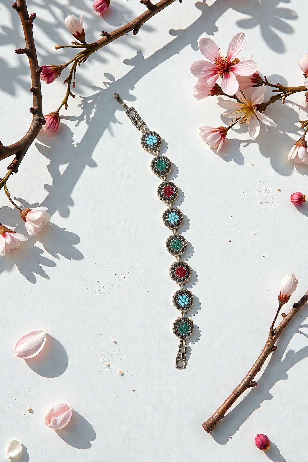 Dieses farbenfrohe Armband verbindet traditionelle Ornamentik mit modernem Boho-Stil. Die runden Blütenelemente wechseln sich in Türkis, Smaragdgrün und Dunkelrot ab und verleihen dem Schmuckstück Lebendigkeit und Ausdruck. Die antik-silberne Umrahmung sorgt für einen stilvollen Vintage-Look, der sich vielseitig kombinieren lässt – ideal für Alltag oder besondere Anlässe.