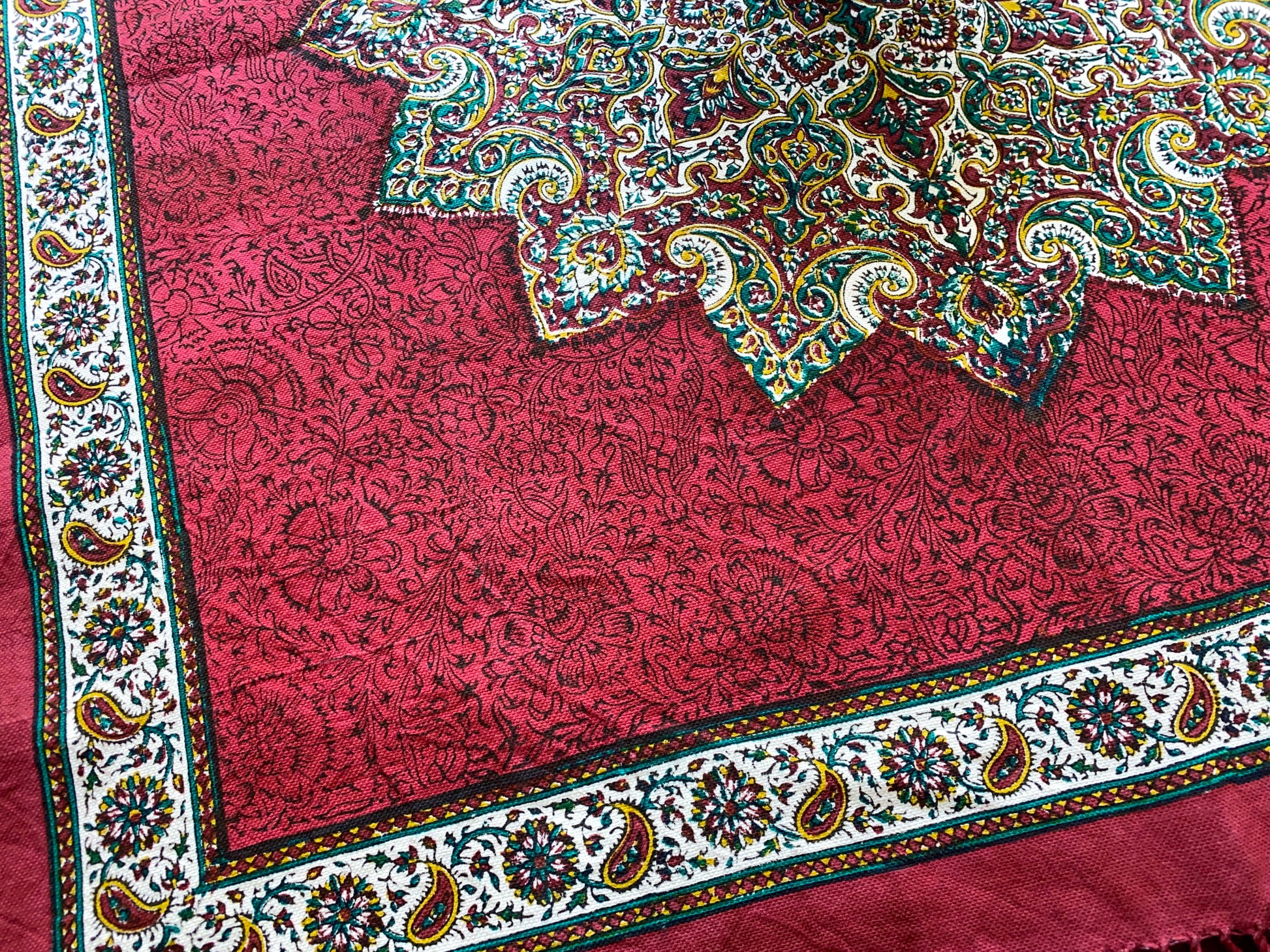 Der Fokus liegt auf dem sternförmigen Mittelmotiv, das von detailreichen floralen und Paisley-Elementen durchzogen ist. Das kräftige Rubinrot im Hintergrund und in den Fransen bringt Wärme, während die weiße Bordüre mit Paisley-Print für Kontrast und Raffinesse sorgt. Ideal für klassische Räume, Essbereiche oder feierliche Anlässe.