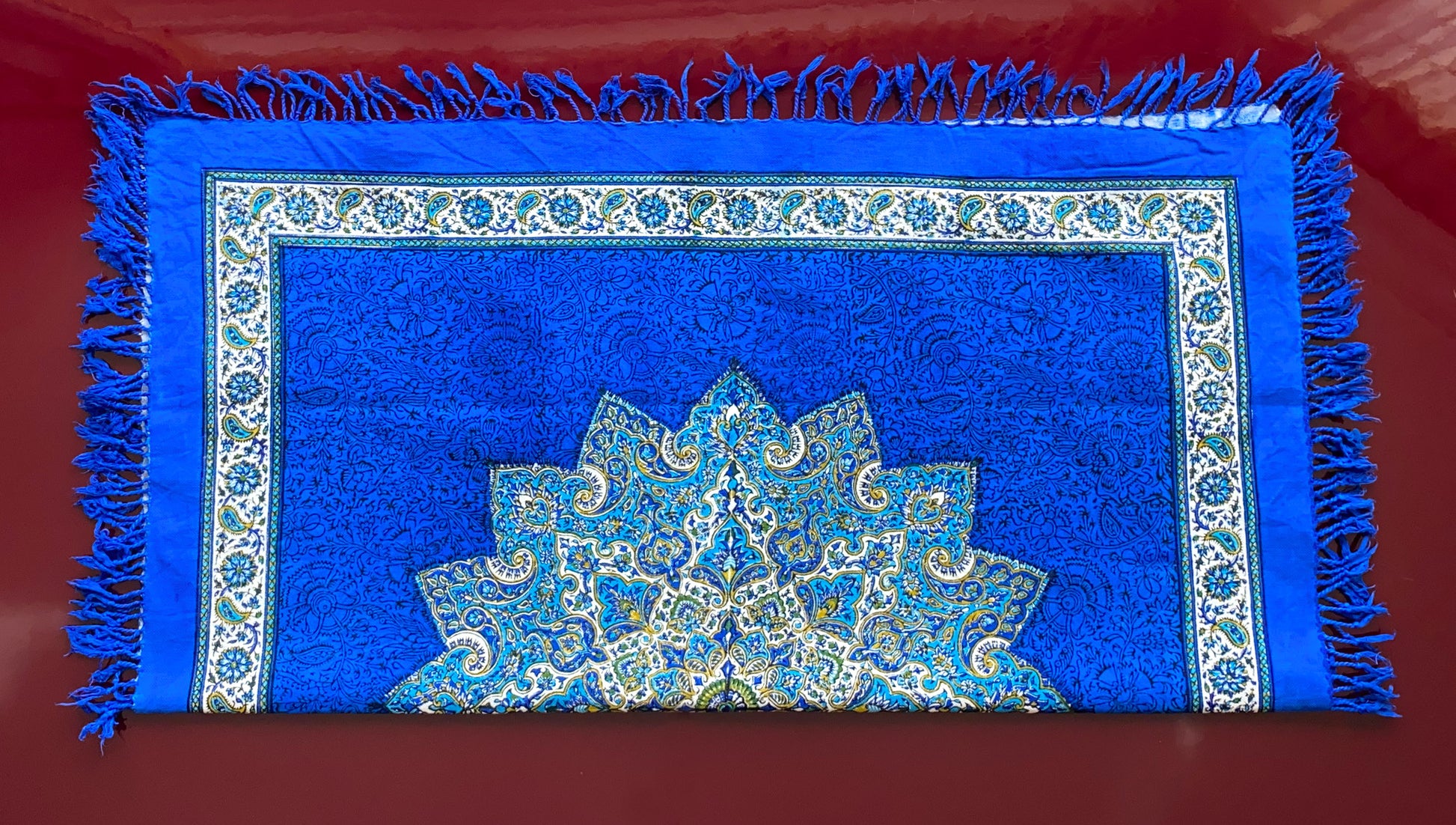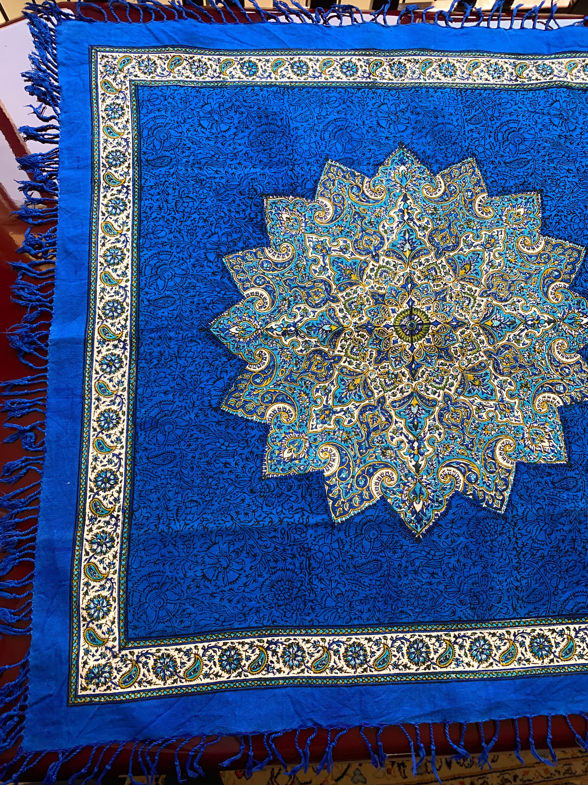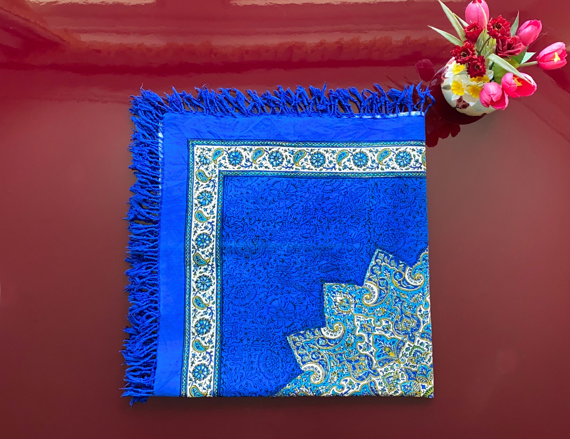 Termeh-Tischdecke (80 x 80 cm) – Ghalamkar Baumwolle | Orient-Dekoration – Handbedruckt & Handgewebt – Königsblauer Stern