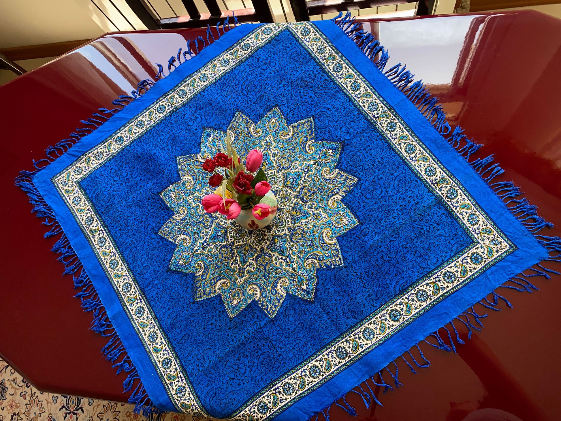 Diese handgefertigte Ghalamkar-Tischdecke verbindet traditionelle persische Handdruckkunst mit einem intensiven, modernen Farbspiel. Gefertigt aus 100 % natürlicher Baumwolle, wird sie nach klassischer Methode in mehreren Druckschritten kunstvoll bedruckt.