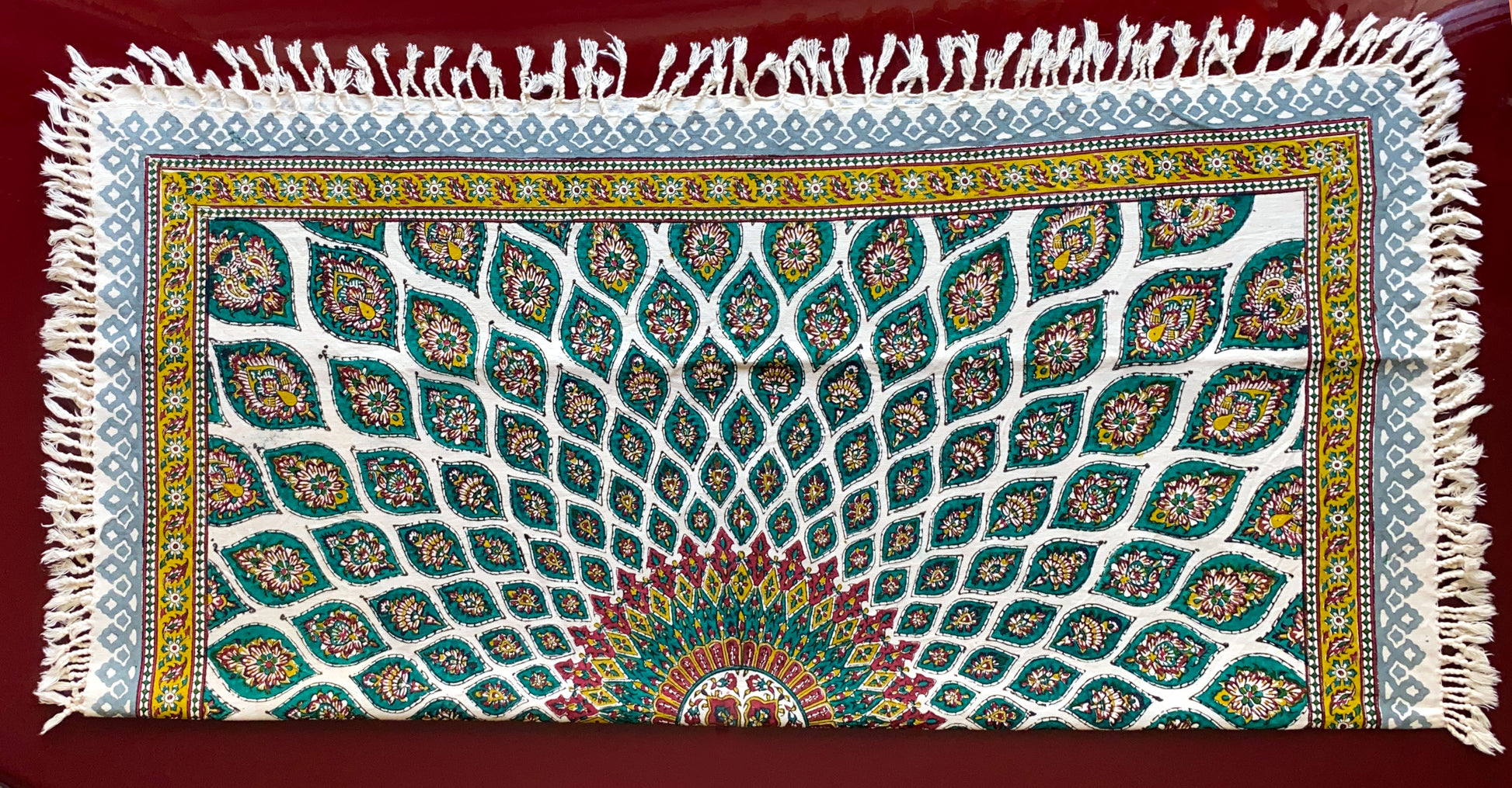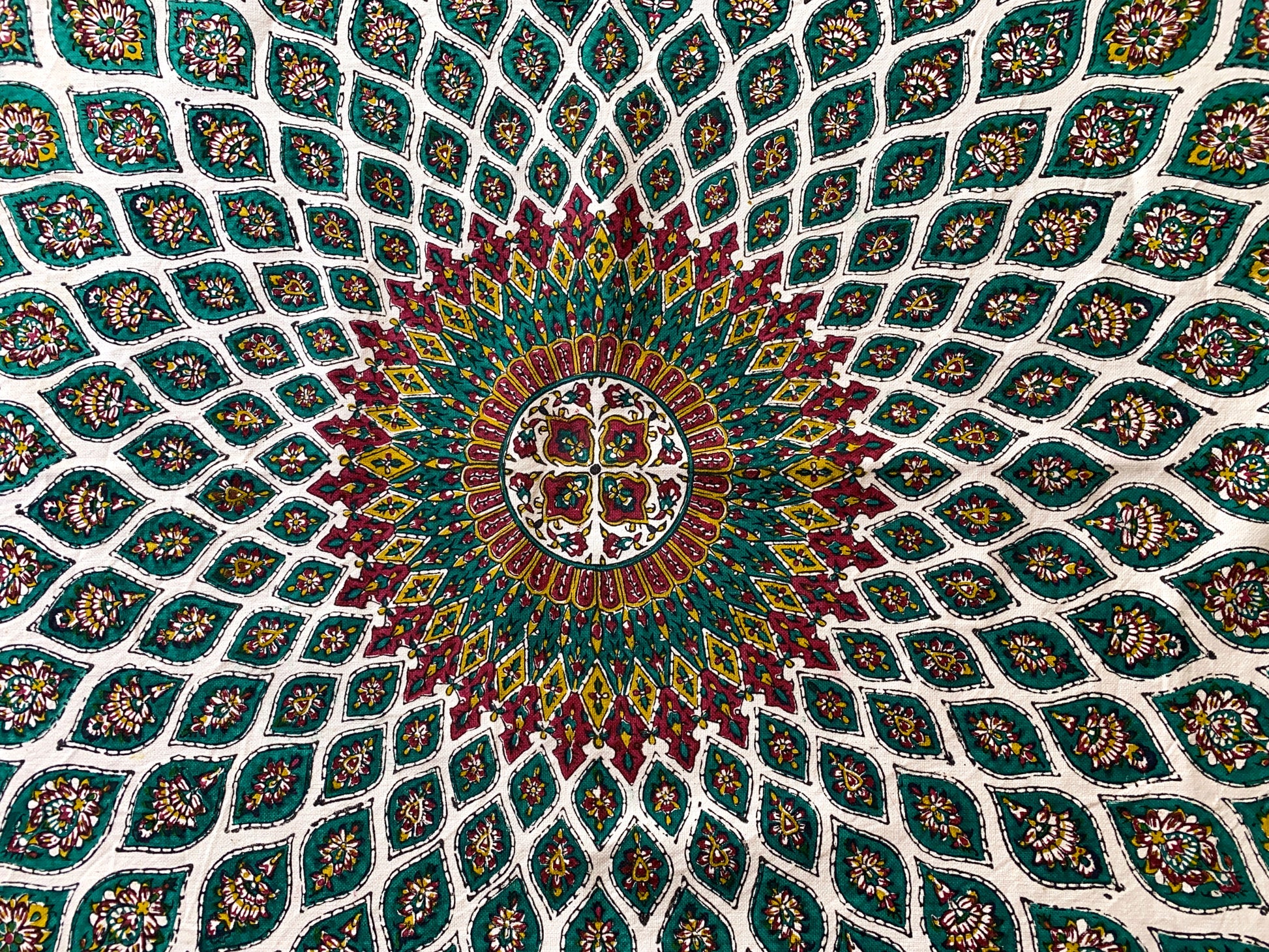 Diese außergewöhnliche Ghalamkar-Tischdecke vereint traditionelle persische Textilkunst mit lebendiger Ornamentik. Handbedruckt auf reiner Baumwolle, zeigt sie ein dynamisches Design mit kaleidoskopischer Wirkung – ein echter Blickfang für jedes Zuhause.
