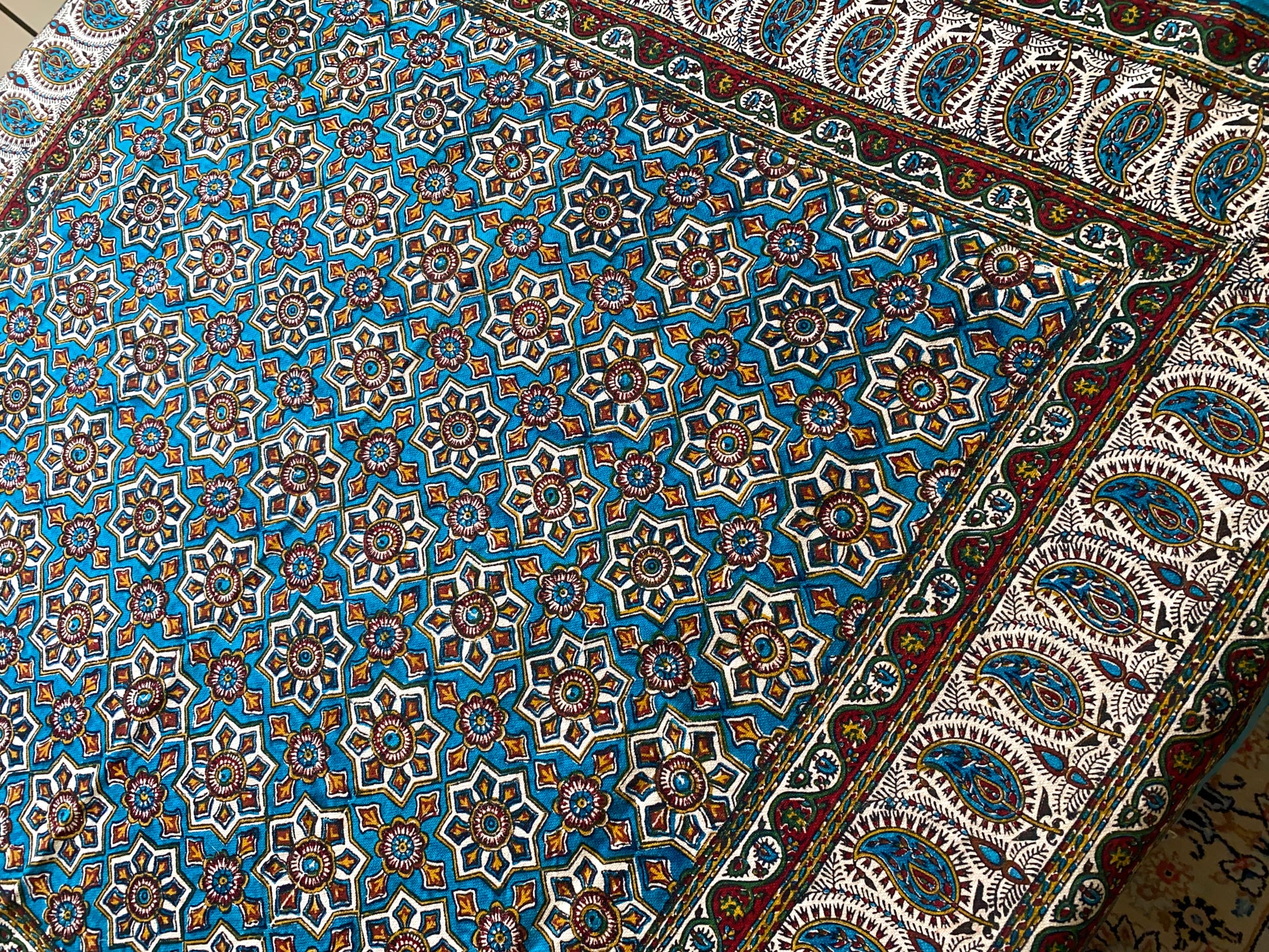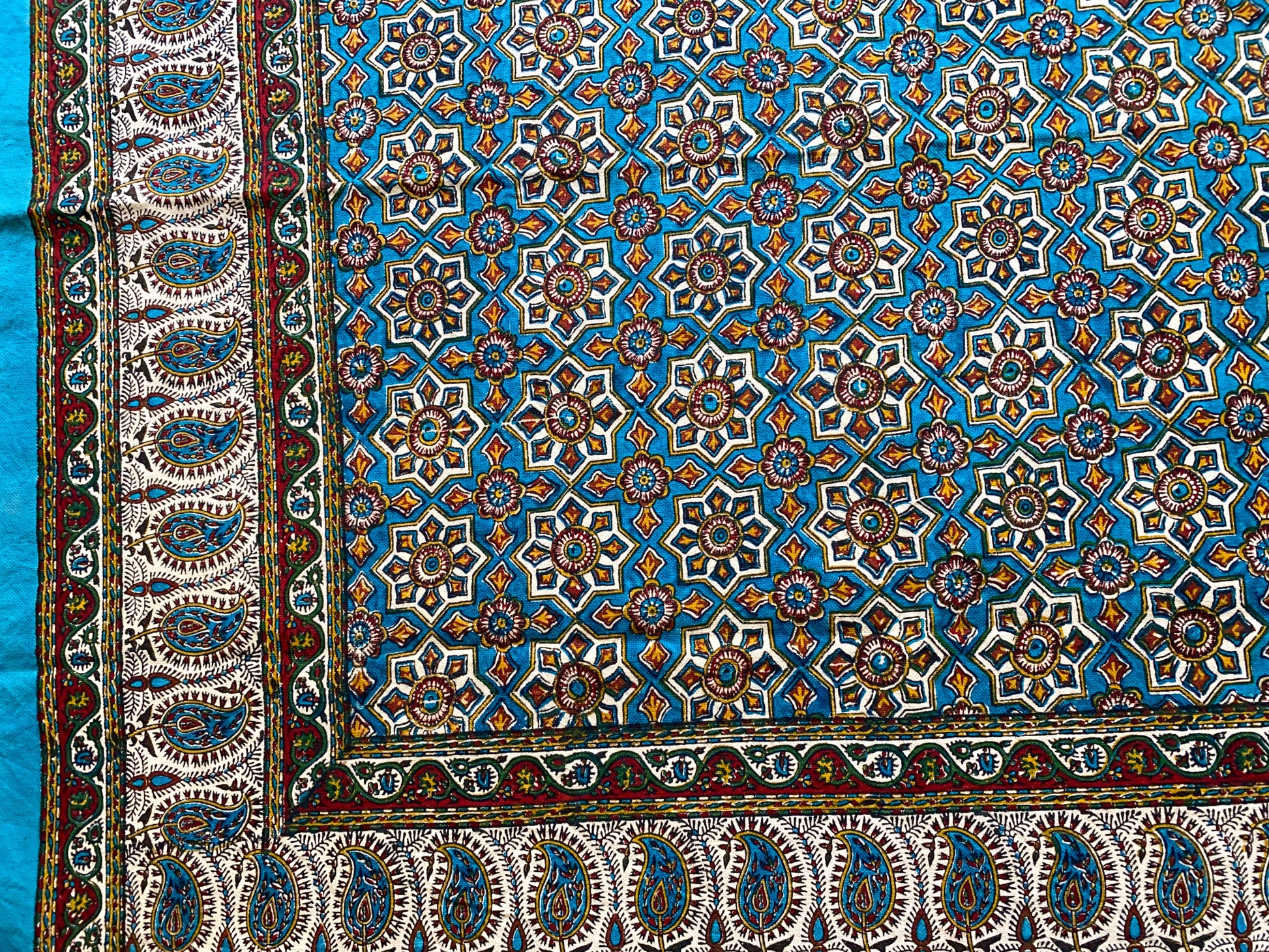 Diese kunstvoll gefertigte Ghalamkar-Tischdecke verbindet traditionelles persisches Handwerk mit orientalischer Geometrie. Aus 100 % Baumwolle und in klassischer Holzstempeltechnik handbedruckt, ist sie ein hochwertiger Akzent für alle, die Authentizität und klare Muster schätzen.