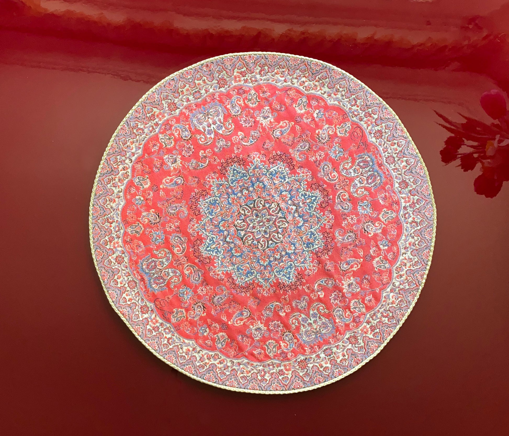 Runde Termeh-Tischdecke (38 cm) – Traditionelles persisches Design in Rot & Türkisblau | Seide & Baumwolle
