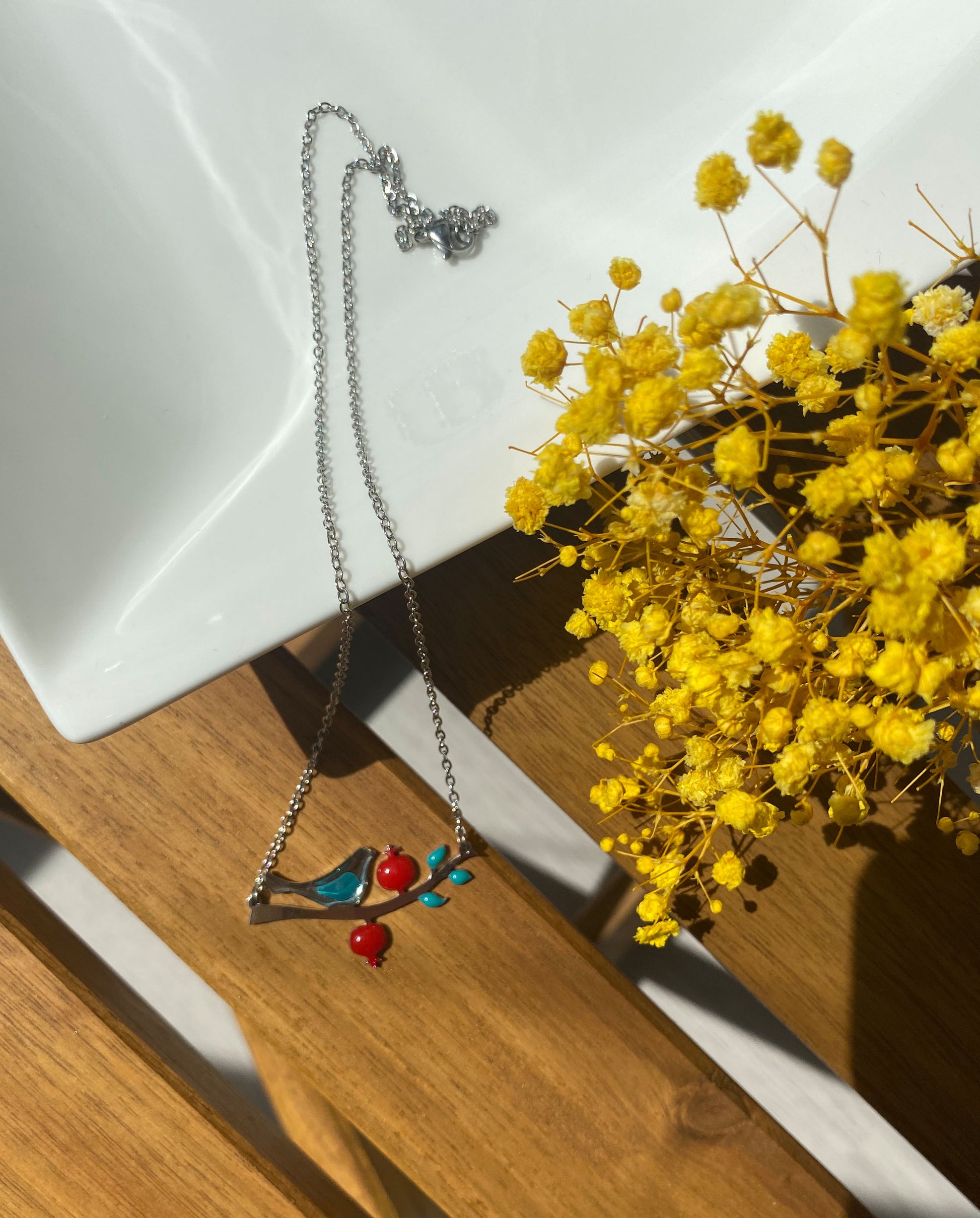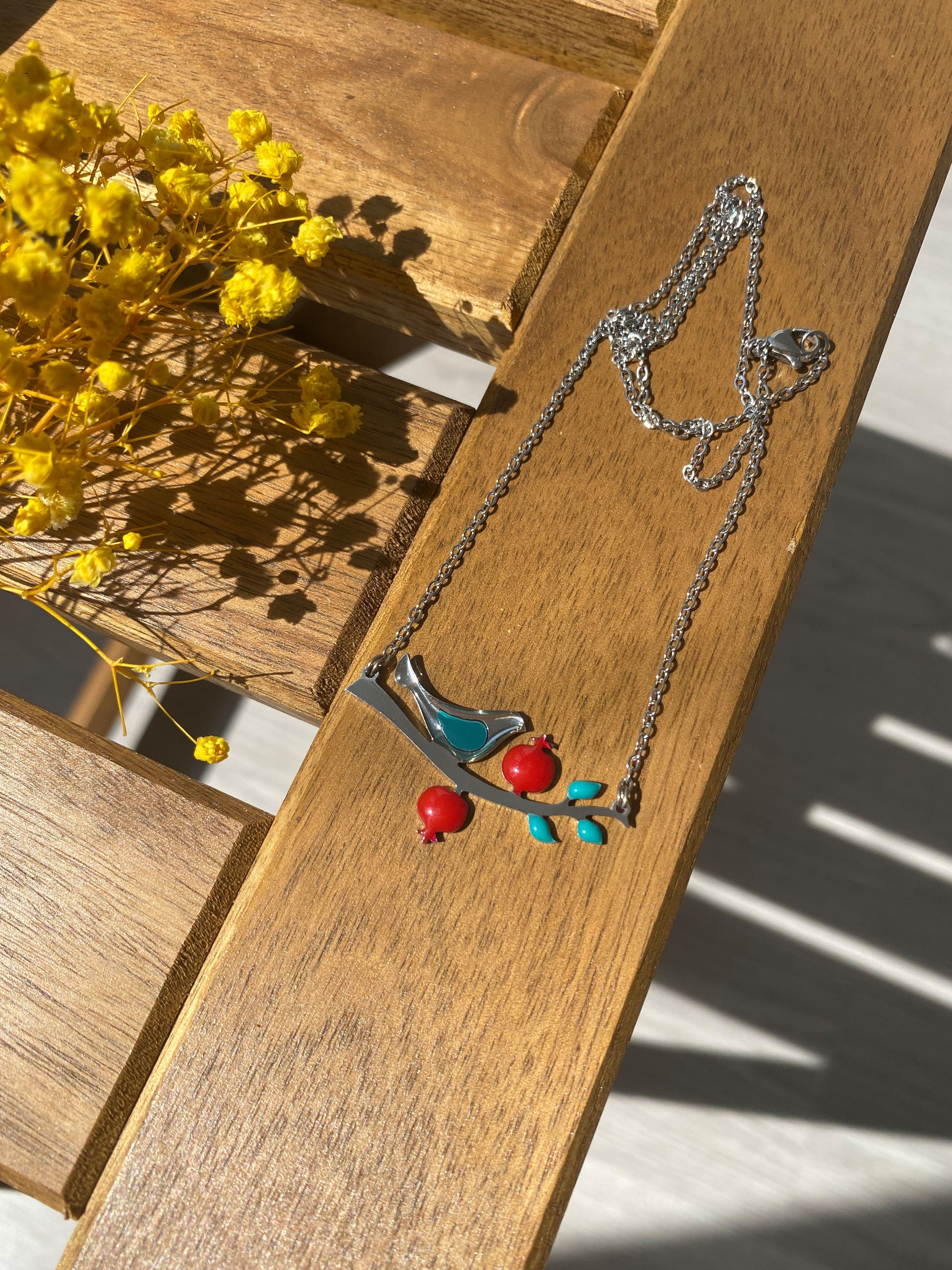 Diese zauberhafte Halskette vereint poetische Naturmotive mit einem Hauch orientalischer Symbolik. Der detailreiche Anhänger zeigt einen stilisierten Vogel auf einem Ast mit zwei roten Granatäpfeln und türkisen Blättern – ein Zusammenspiel von Natur, Leben und Harmonie.