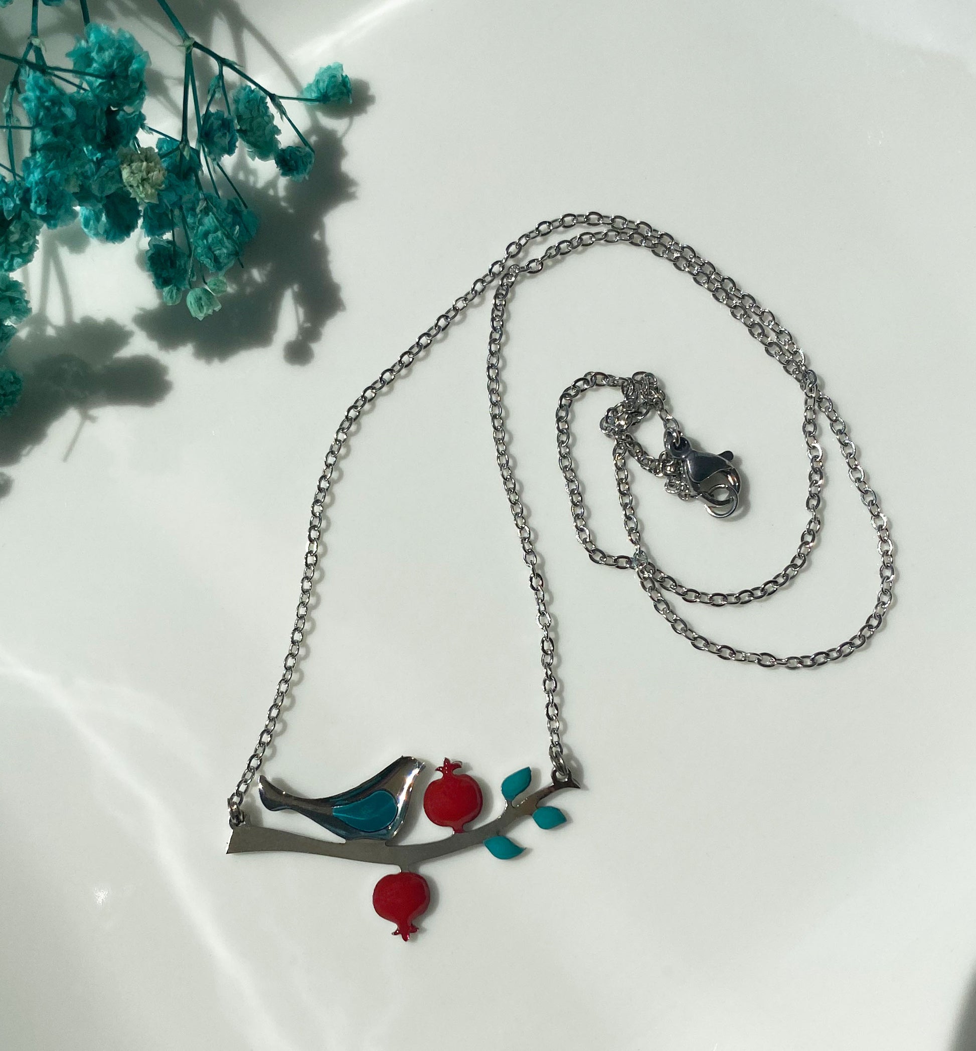 Kette mit Vogel & Granatapfel – Handgefertigt mit Emaille in Türkis & Rot