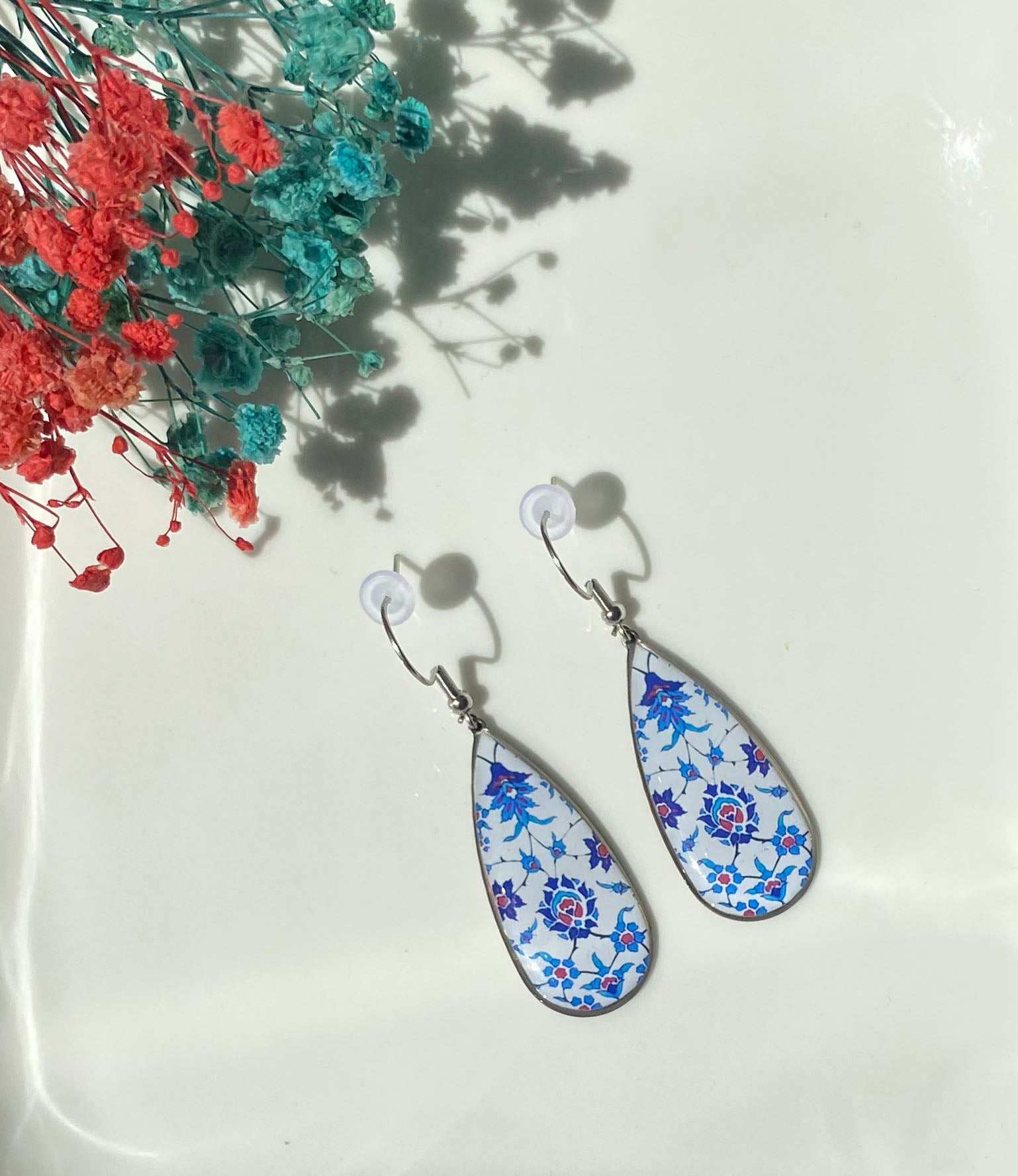 Diese handgefertigten Ohrringe in eleganter Tropfenform vereinen traditionelle orientalische Musterkunst mit modernem Design. Die Vorderseite ziert ein fein detailliertes, florales Muster in Blau-, Rot- und Türkistönen auf weißem Untergrund – inspiriert von klassischer persischer Fliesenkunst. Die leichten Ohrringe sind angenehm zu tragen und ideal als stilvoller Hingucker im Alltag oder zu besonderen Anlässen.
