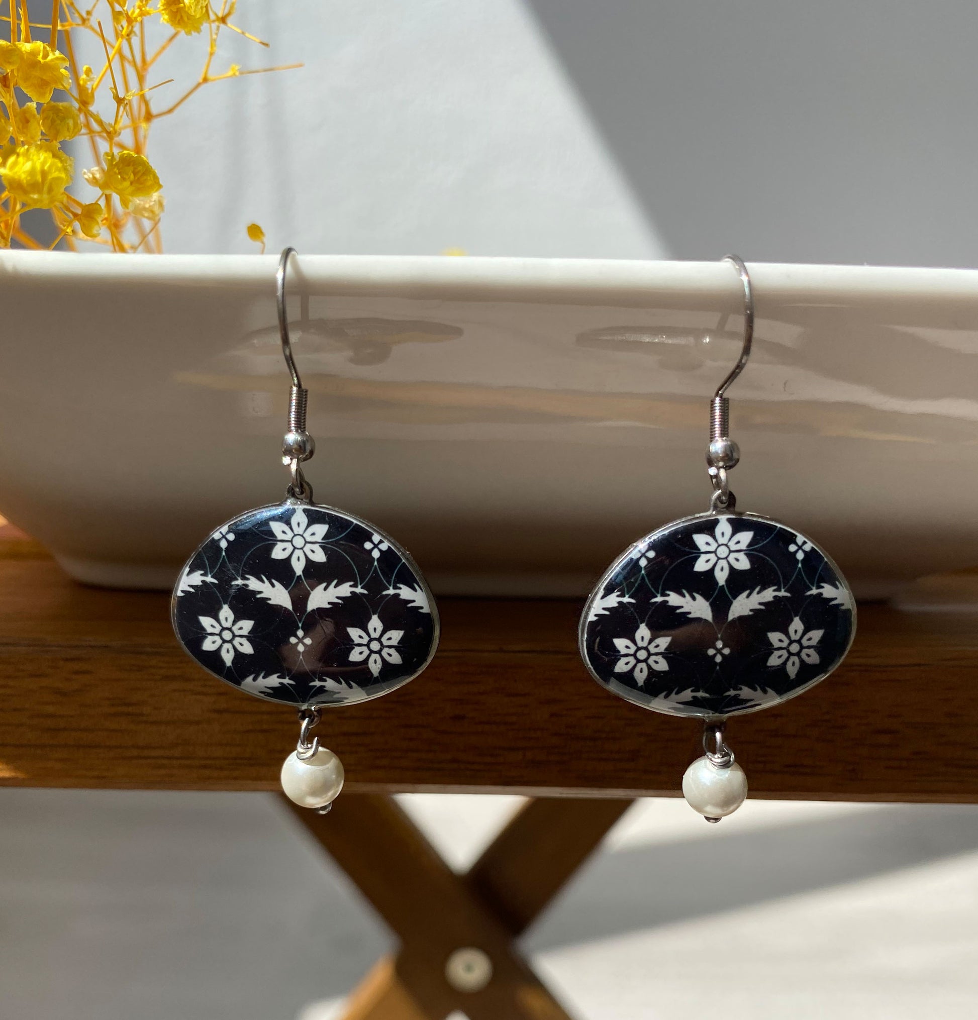 Orientalische Ohrringe mit schwarzem Blumenmuster & Perle – Tropfenform | Handgemacht